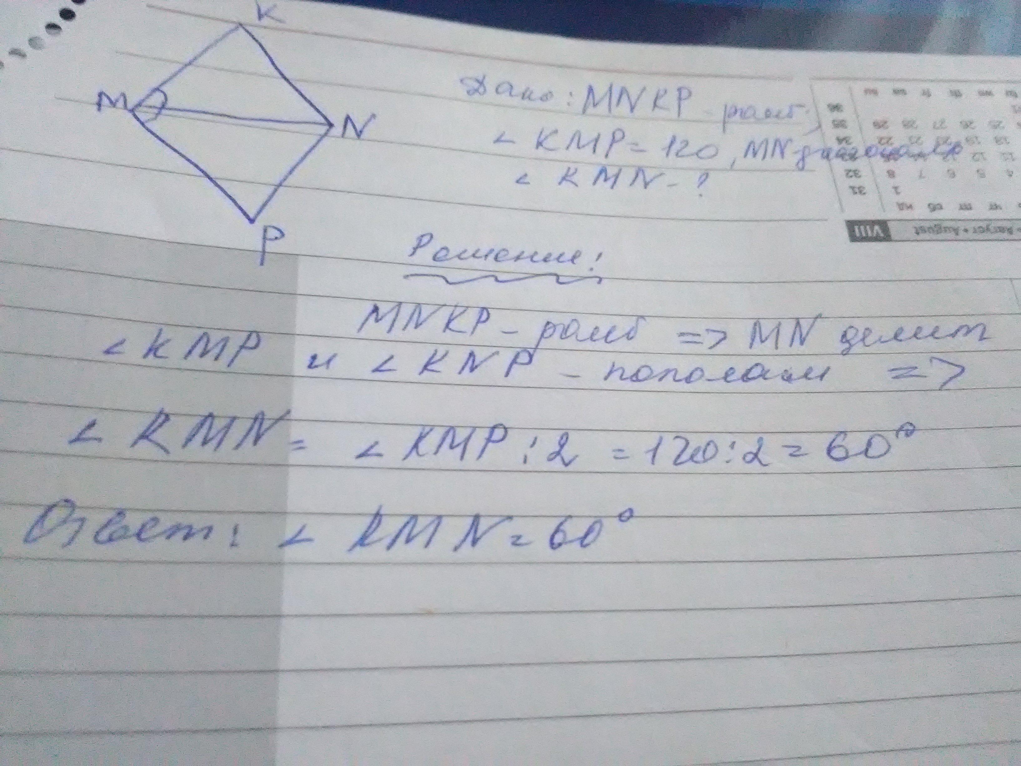 В ромбе MNKP диагональ MN. Найдите угол KMN , если известно, что угол KMP=120°