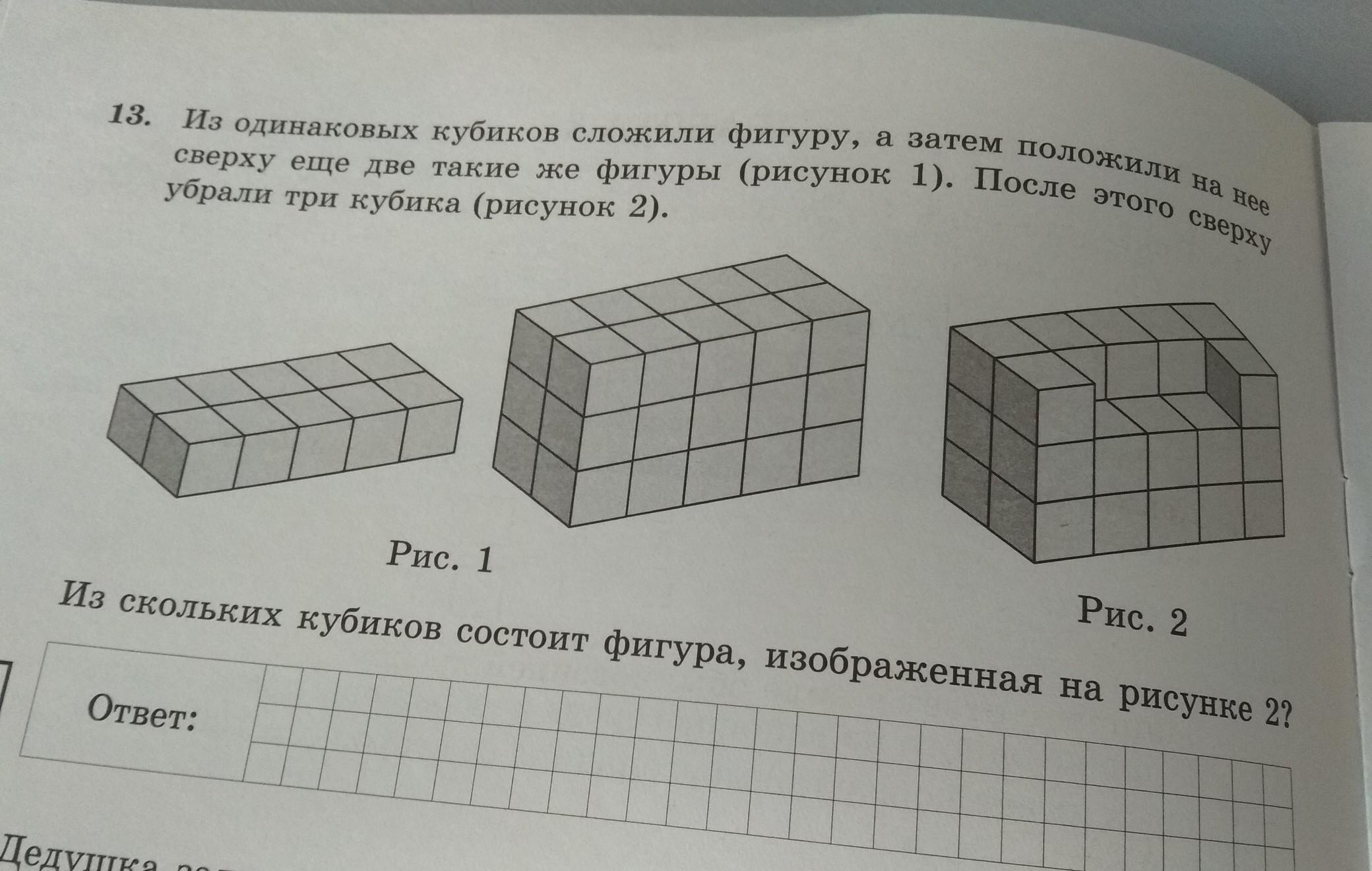 Из одинаковых кубиков сложили фигуру , а затем положили на нее сверзу еще две такие же фигуры (рисунок 1 ).После этого сверху убрали три кубика (рисунок 2).