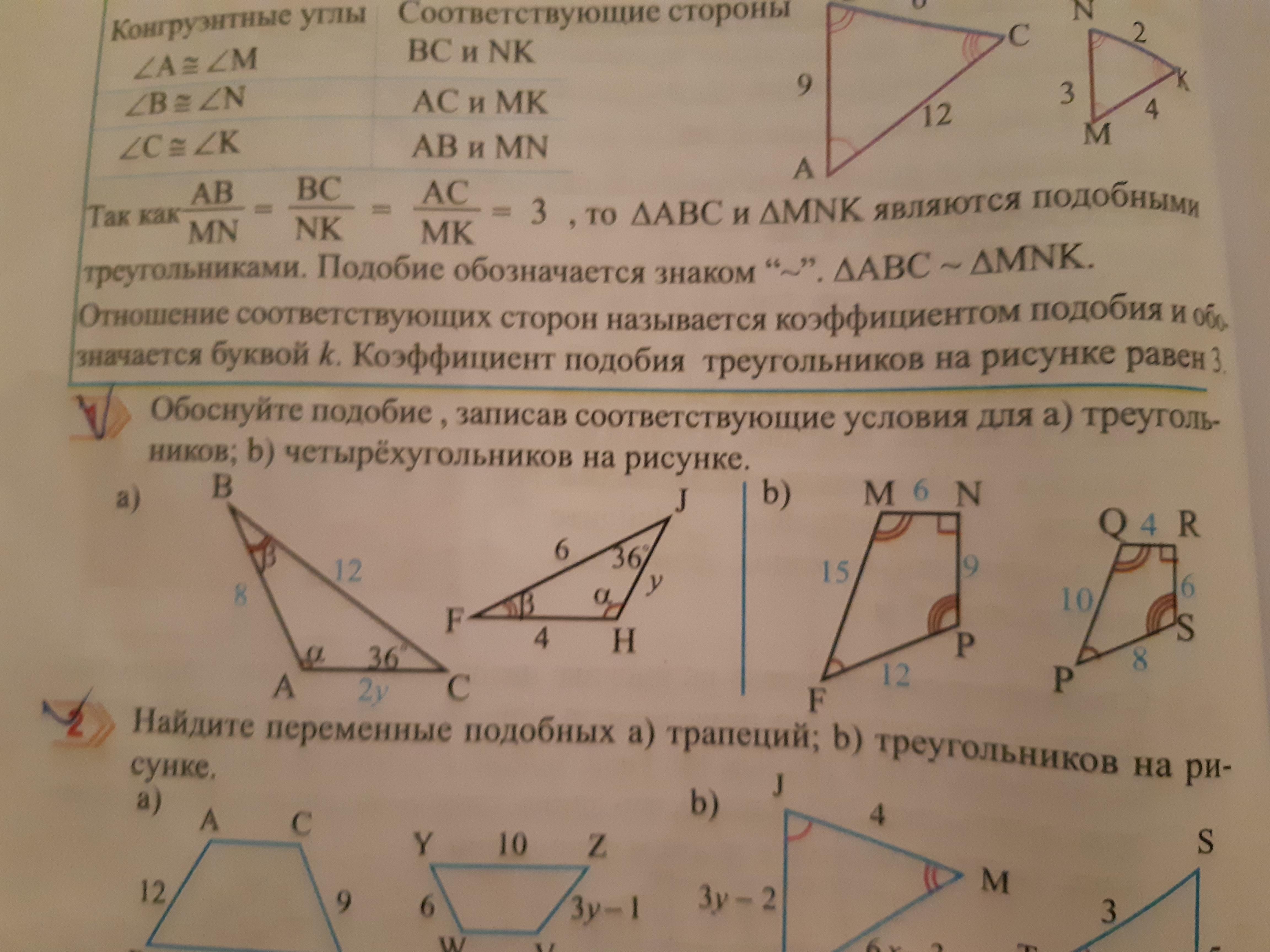 Обоснуйте подобие записав соответствующие условия для а) треугольников b) четырехугольников на рисунке