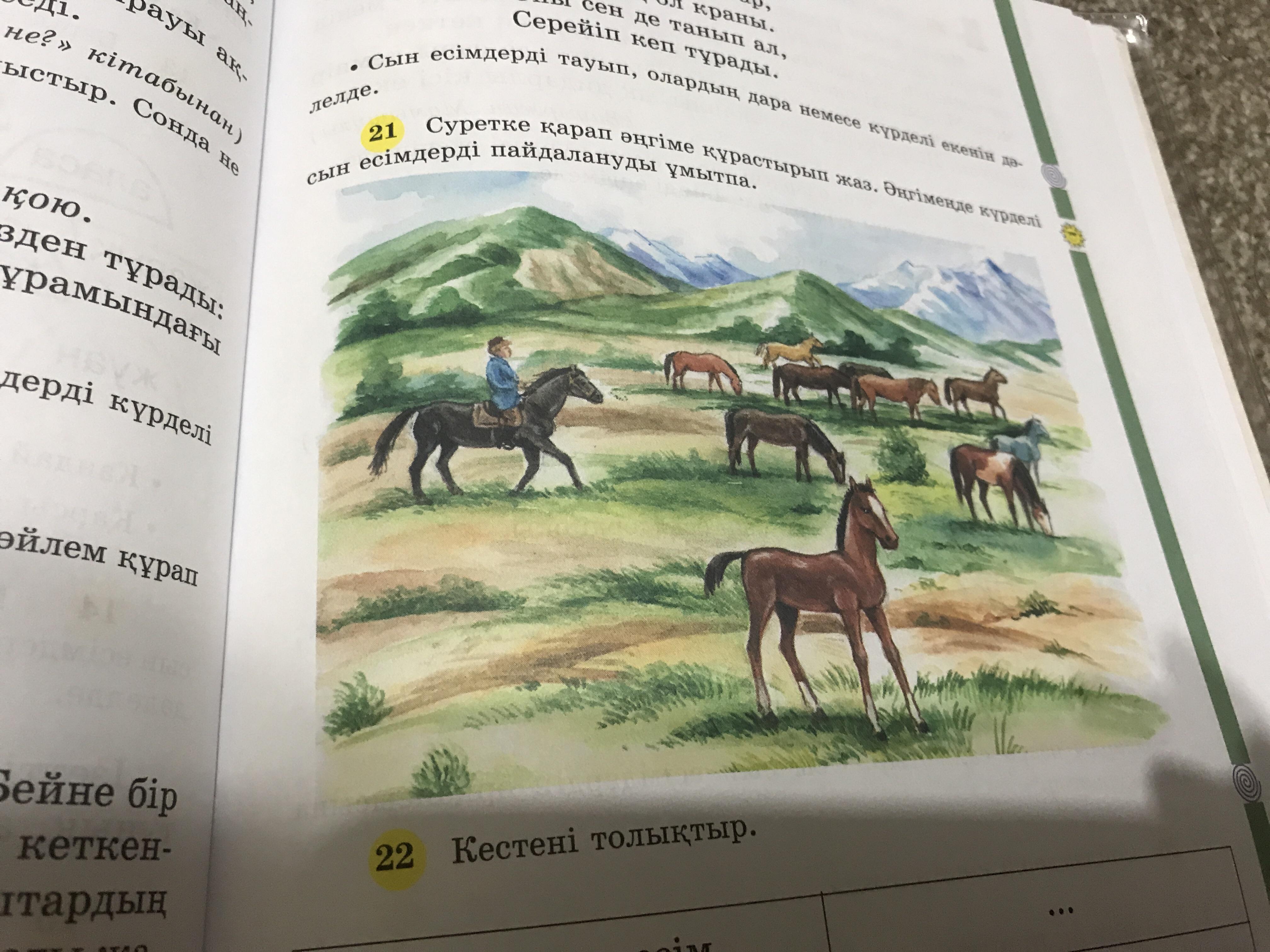 Ауылдың табиғаты әдемі.даланын бәрі жап-жасыл шөп болып тұр.атам кара курең атпен малдарды багады.оларды ала боз ат баскарады.