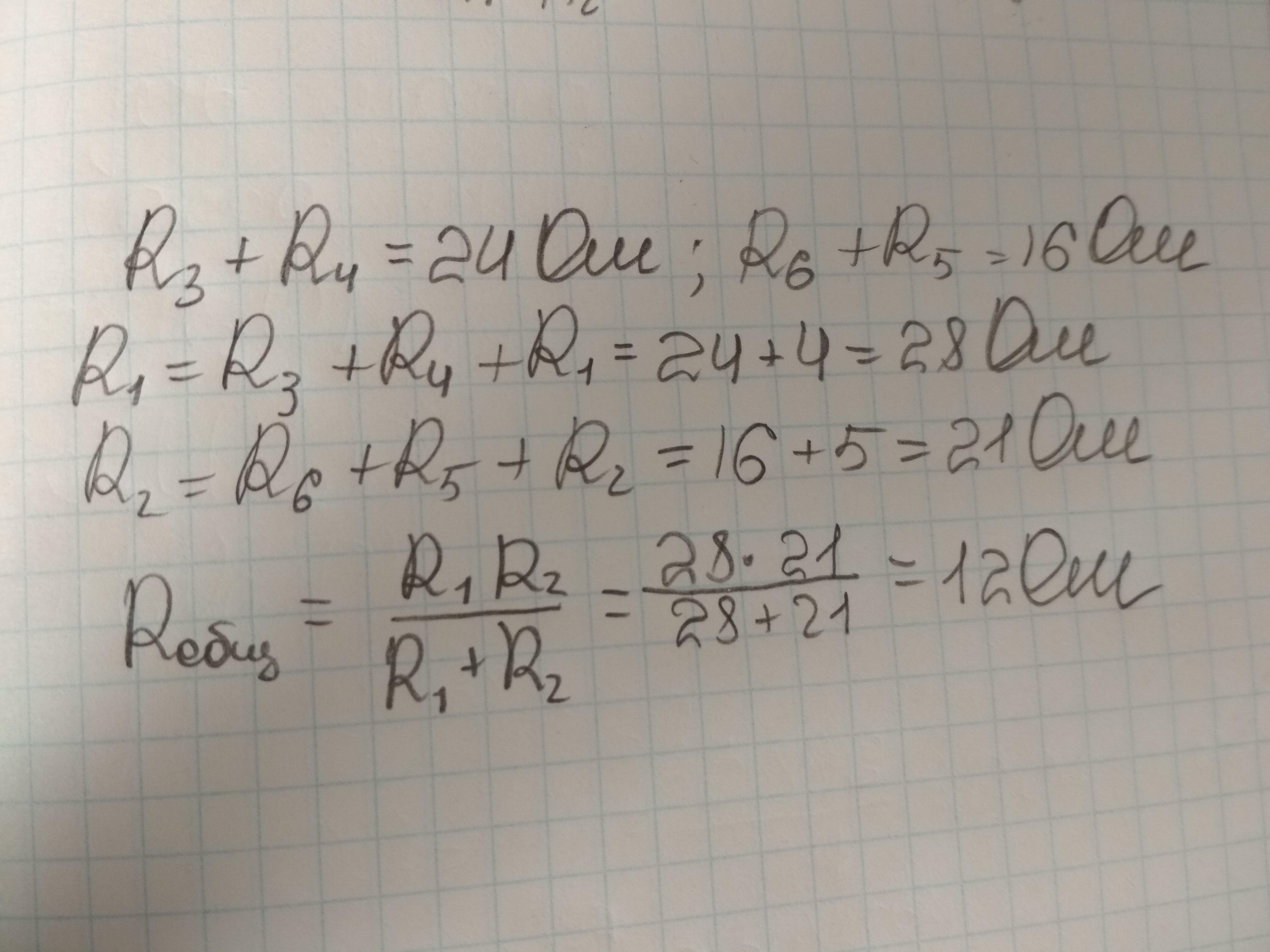 3. Сложим R3+R6+R5=4+4+12=20om, эти 20ом стоят паралельно R3=20om, это будет 10ом. Теперь суммируем R1+R3,4,5,6+R2=4+10+5=19ом.