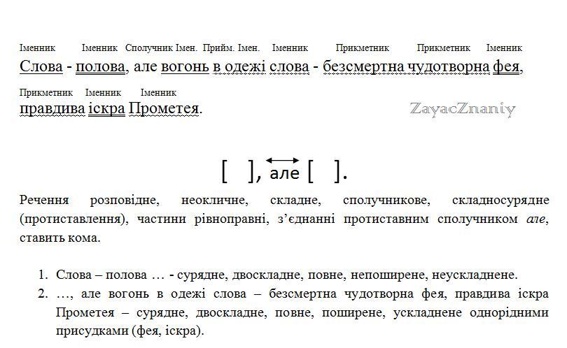 аналіз складносурядного речення: Слова - полова, але вогонь в одежі слова - безсмертна чудотворна фея, правдива іскра Прометея