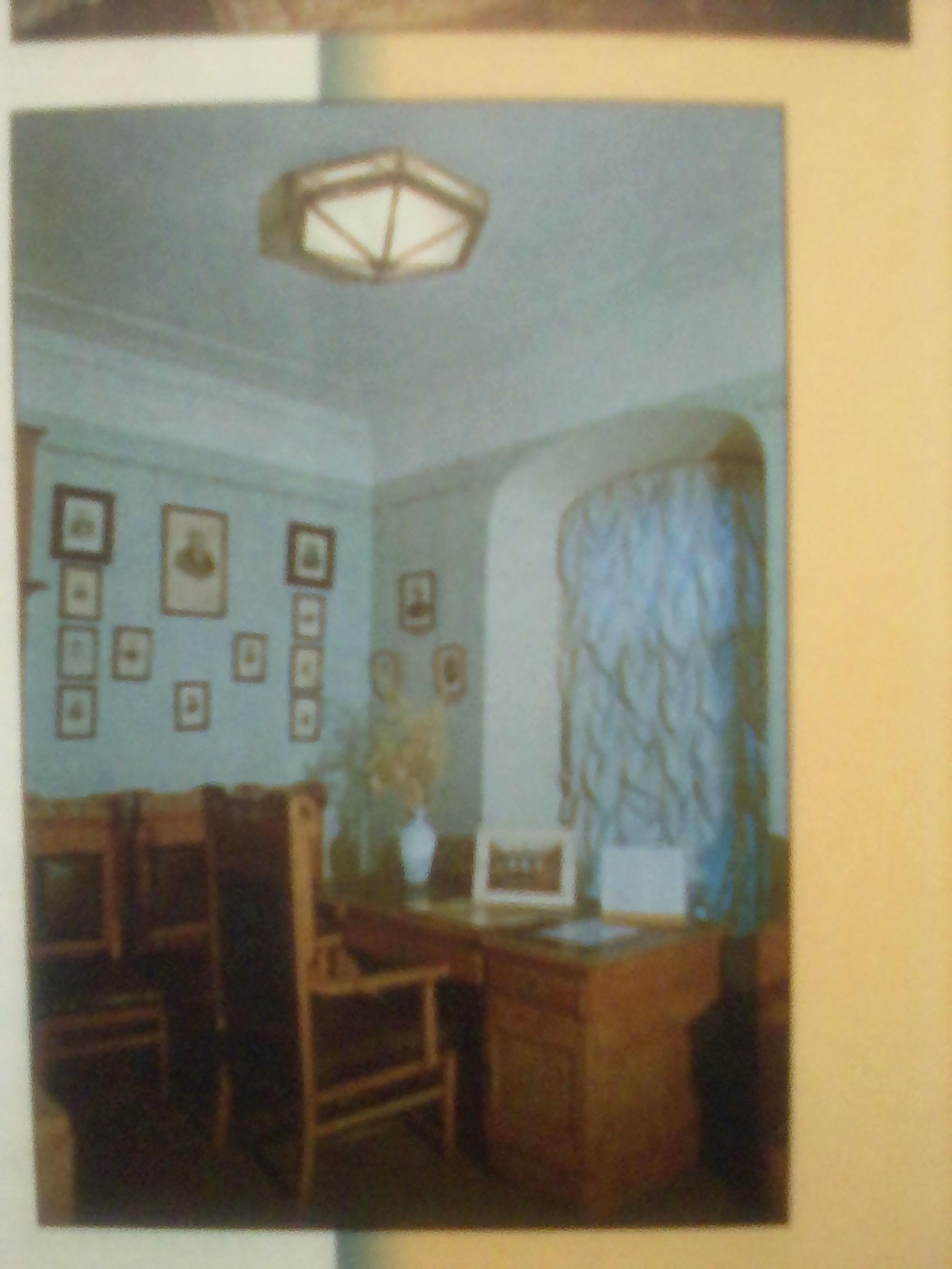 На этой картине я вижу комнату (чей-то личный кабинет). На переднем плане стоит стол из дерева со стульями. Рядом со столом стоят ещё несколько стульев. На стульях есть кожаные вставки. На столе стоит ваза, картинка в рамке и лежат листы. Комната покрашена синим цветом. На стене весят портреты. Напротив стола большое окно. Оно закрыто занавесом. Сверху весит красивая люстра.