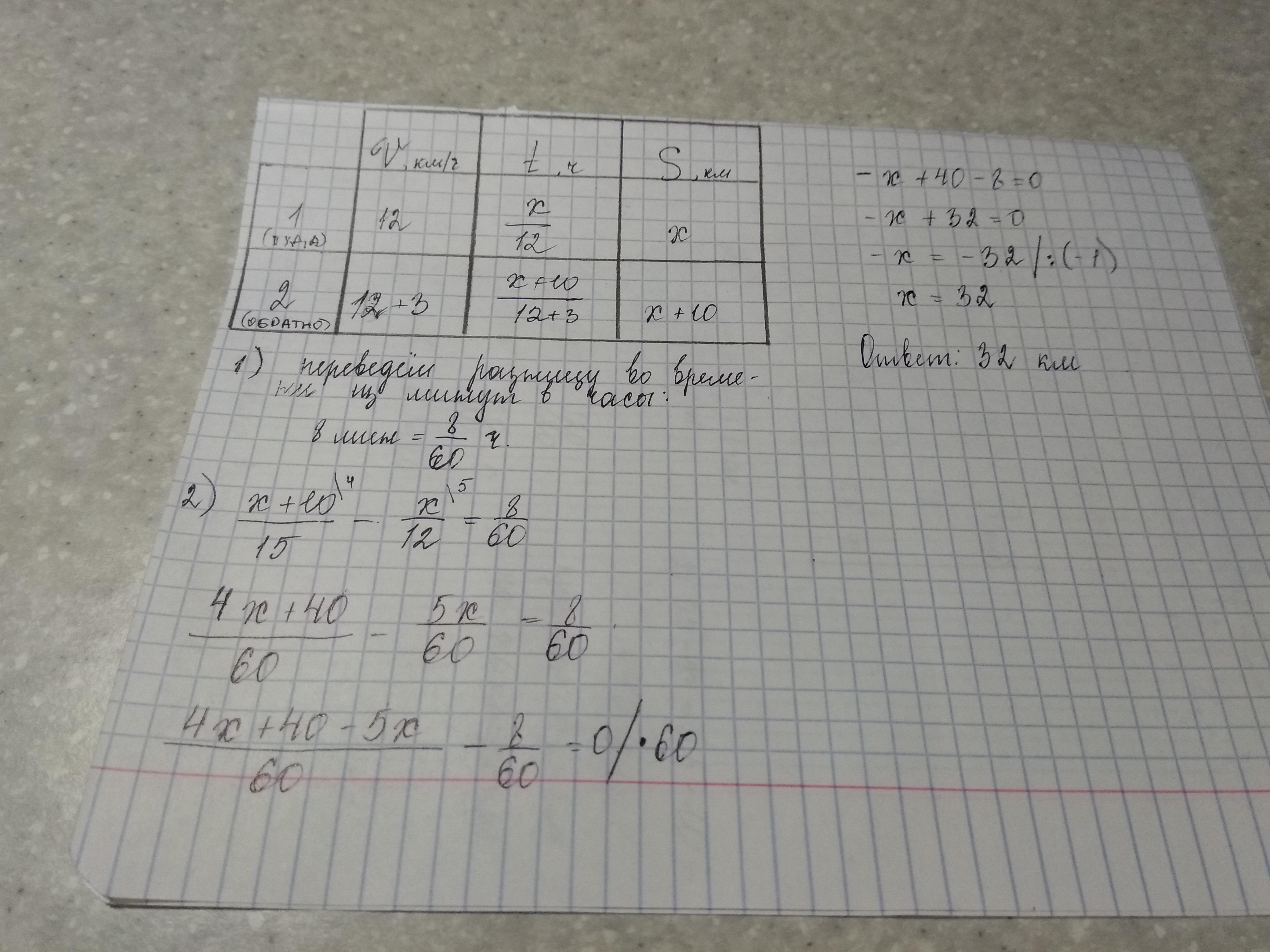 лыжник прошел расстояние от а до б со скоростью 12 км ч а возвращался обратно по другой дороге которая оказалась длиннее первой на 10 км развив на обратном пути скорость на 3 км ч больше первоначальной лыжник всё же затратил на обратный путь на 8 минут больше чем на путь из а в б найти расстояние от а до б.
