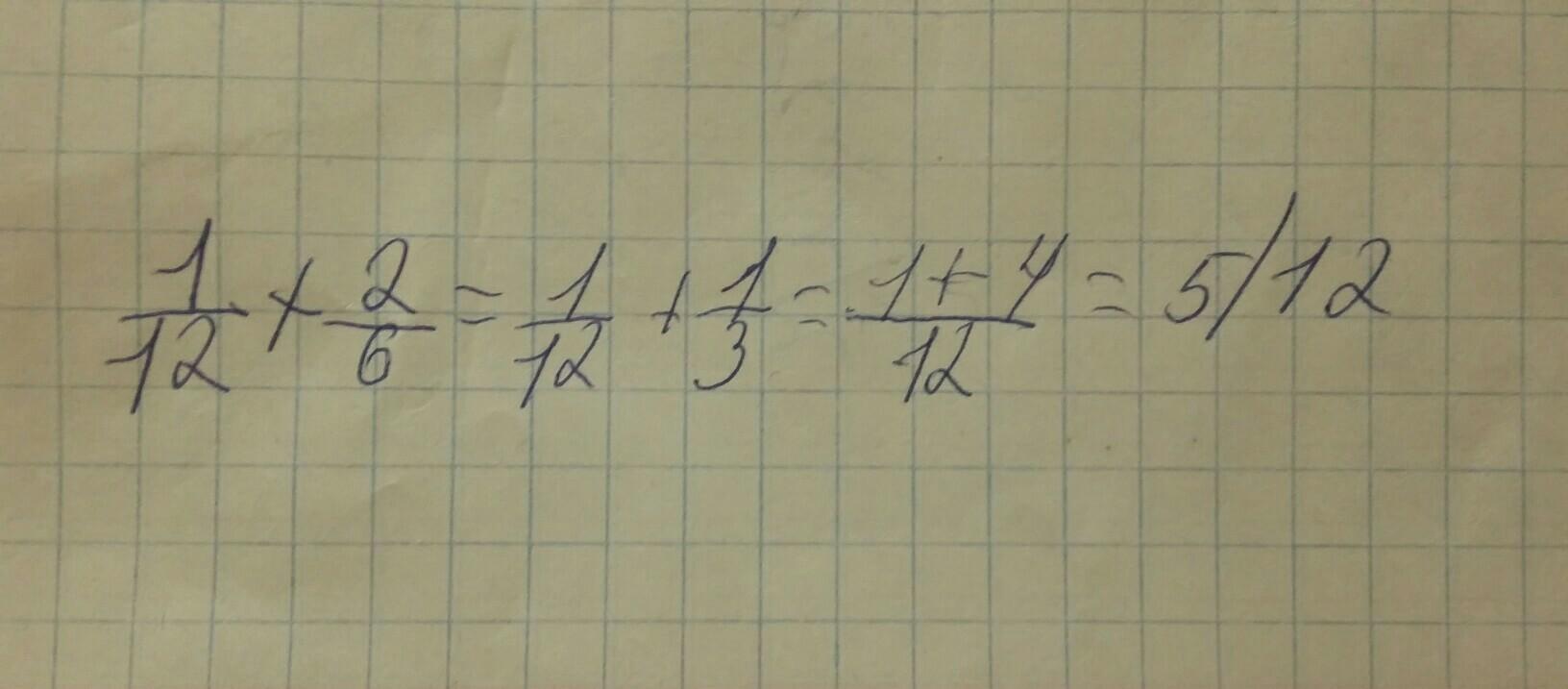 Пошаговое объясненение: сначало приведём к общему знаменателю 12 и получится 1/12 и 4/12 и сложим числители