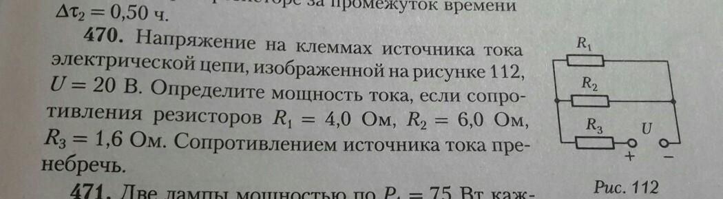 напряжение на клеммах источника тока электрической цепи, изображенный на рисунке 112, U=20В. определите мощность тока, если сопротивления резисторов R1=4Ом, R2=6Ом, R3=1,6Ом. Сопротивлением источника тока пренебречь