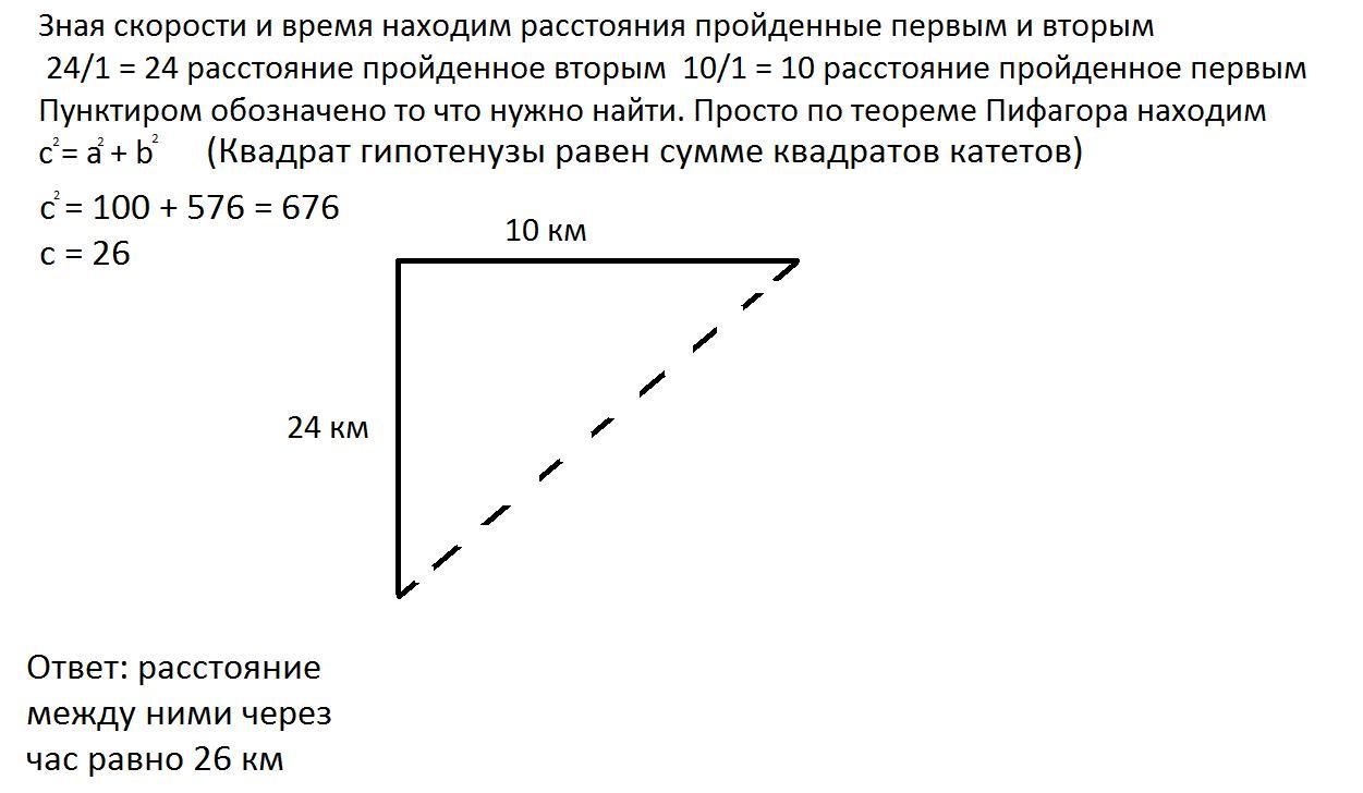 Две автомашины выехали из посёлка, следуя одна на восток, а другая на юг. Скорости их соответственно равны 10км/ч и 24км/ч. какое расстояние будет между ними через 1 час?
