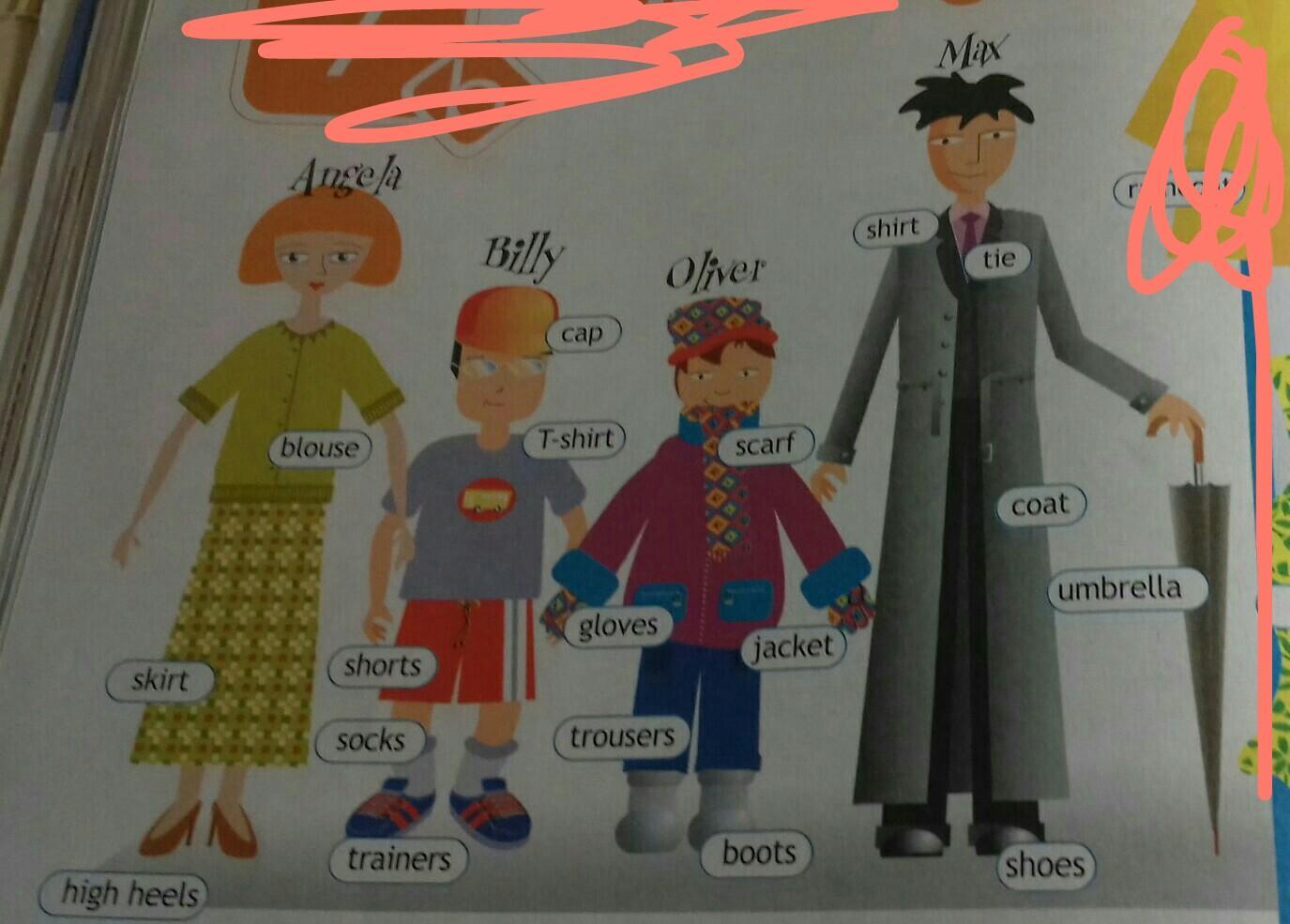 Oliver is wearing a scarf, a jacket, gloves, trousers and boots.
