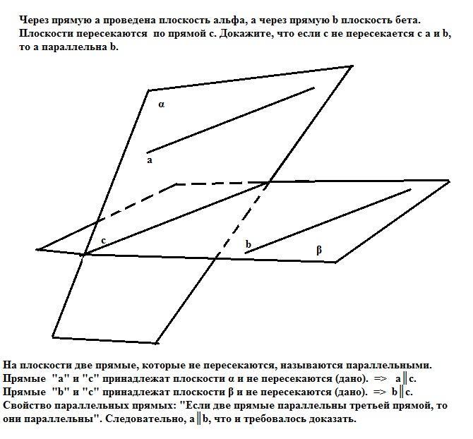 Через прямую a проведена плоскость альфа, а через прямую b плоскость бета. Плоскости пересекаются по прямой с. Докажите, что если с не пересекается с a и b? то a параллельна b.