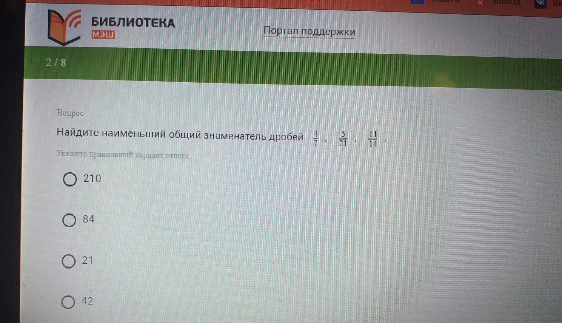 Тогда НОЗ равен 21*2 (недостающий множитель в разложении наибольщего из знаменателей - 21) = 42. Это ответ.