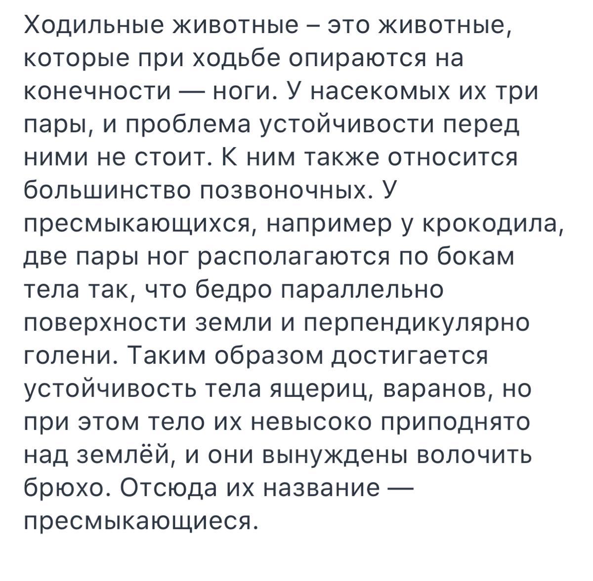 Ходильные животные – это животные, которые при ходьбе опираются на конечности — ноги. У насекомых их три пары, и проблема устойчивости перед ними не стоит. К ним также относится большинство позвоночных. У пресмыкающихся, например у крокодила, две пары ног располагаются по бокам тела так, что бедро параллельно поверхности земли и перпендикулярно голени. Таким образом достигается устойчивость тела ящериц, варанов, но при этом тело их невысоко приподнято над землёй, и они вынуждены волочить брюхо. Отсюда их название — пресмыкающиеся.