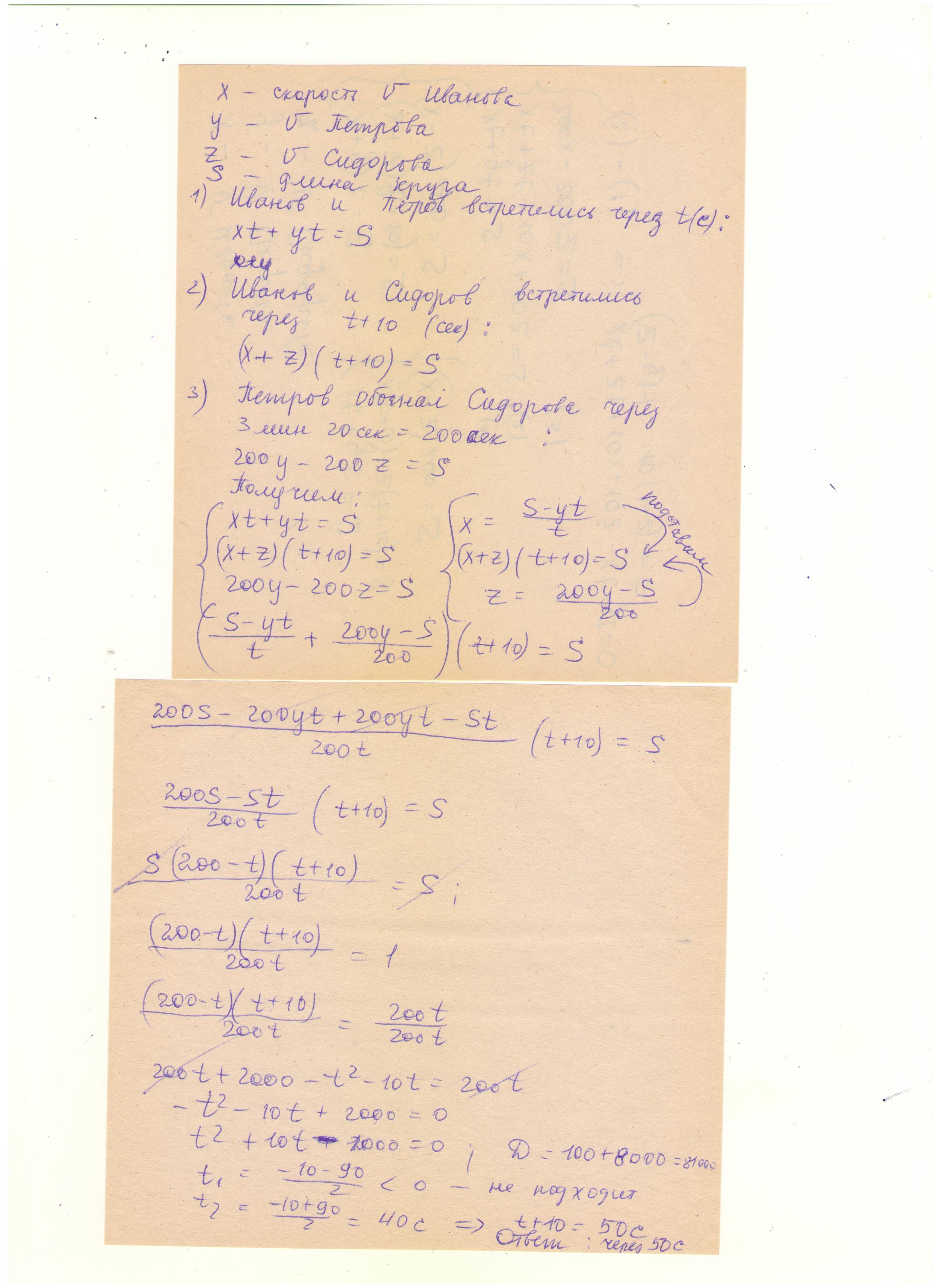 Конькобежцы Иванов, Петров и Сидоров одновременно стартуют из одного и того же места круговой дорожки. Иванов начинает движение в направлении, противоположном направлению движения Петрова и Сидорова, и спустя некоторое время встречает Петрова, а еще через десять секунд Сидорова. Через три минуты и двадцать секунд после старта Петров обогнал Сидорова на один круг. Скорости конькобежцев постоянны. Через сколько секунд после старта Иванов встретился с Сидоровым?