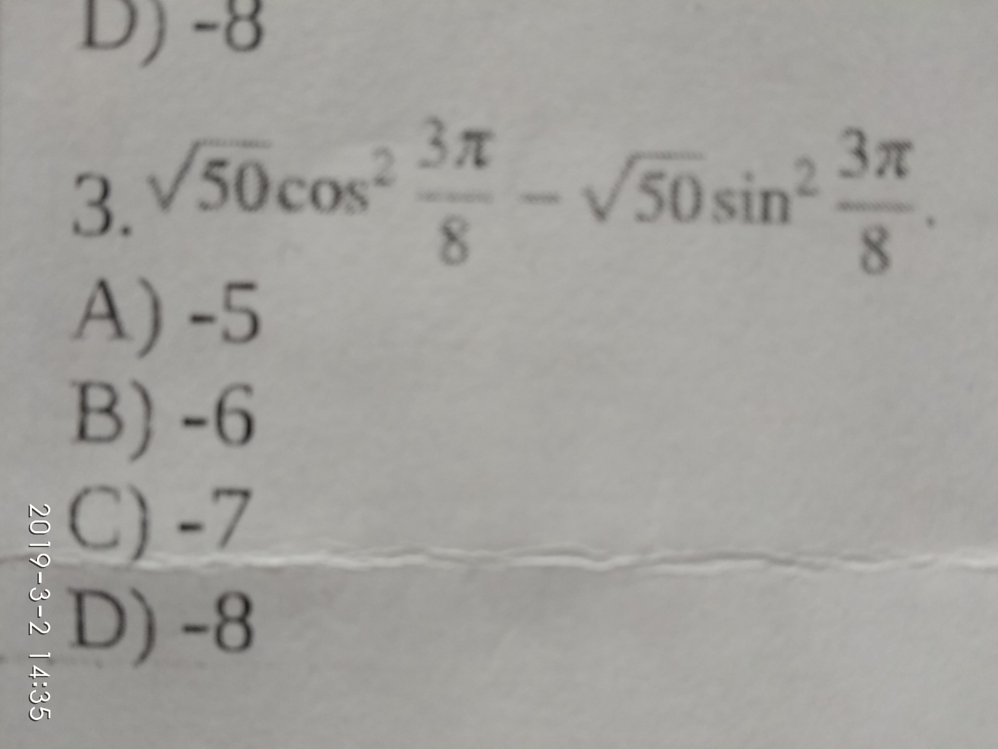 √50(cos²3π/8 - sin²3π/8)=(используем формулу cos 2-ного угла, cos²α - sin²α=cos2α, здесь α=3π/8 , 2*α=3π/4)=√50cos3π/4=√50cos(π-π/4)=(используем формулу приведения для π-α)=√50*(-cosπ/4) =-√50*√2/2=-√100/2=-5