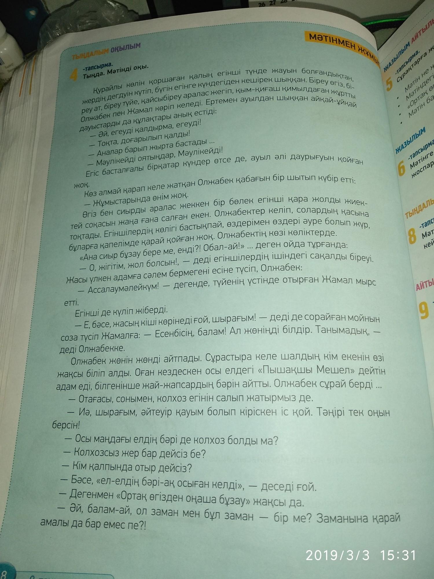 - задание. Слушай. Читайте текст. Так как невеста ждет дождь ночью нердің дегдуін толстый егініші Курайлы окружающей среды, находящиеся в күндегіден шыңқан к посеву. Кто-то, кто мы, мы - реуәт, кто-то пуговицы, смешанные қайсыбіреу жегіп, удорожание-Олжабек Подход усами и косой видеть двигаться постепенно. Утром из аула крик-уши четко слышали голосов в само понятие: