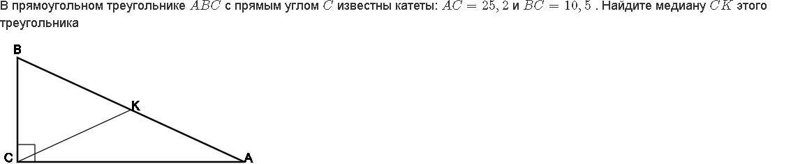3)В прямоугольном треугольнике ABC с прямым углом C известны катеты: AC=25,2 и BC=10,5. Найдите медиану CK этого треугольника.