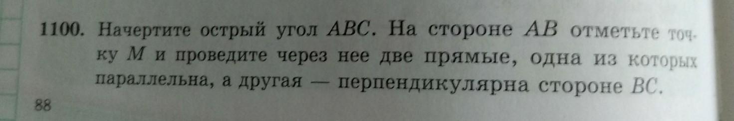 Начертите острый угол ABC .На стороне AB и отметьте точку М И Проведите через неё две прямые, одна из которых параллельна, а другая - перпендикулярная стороне BC