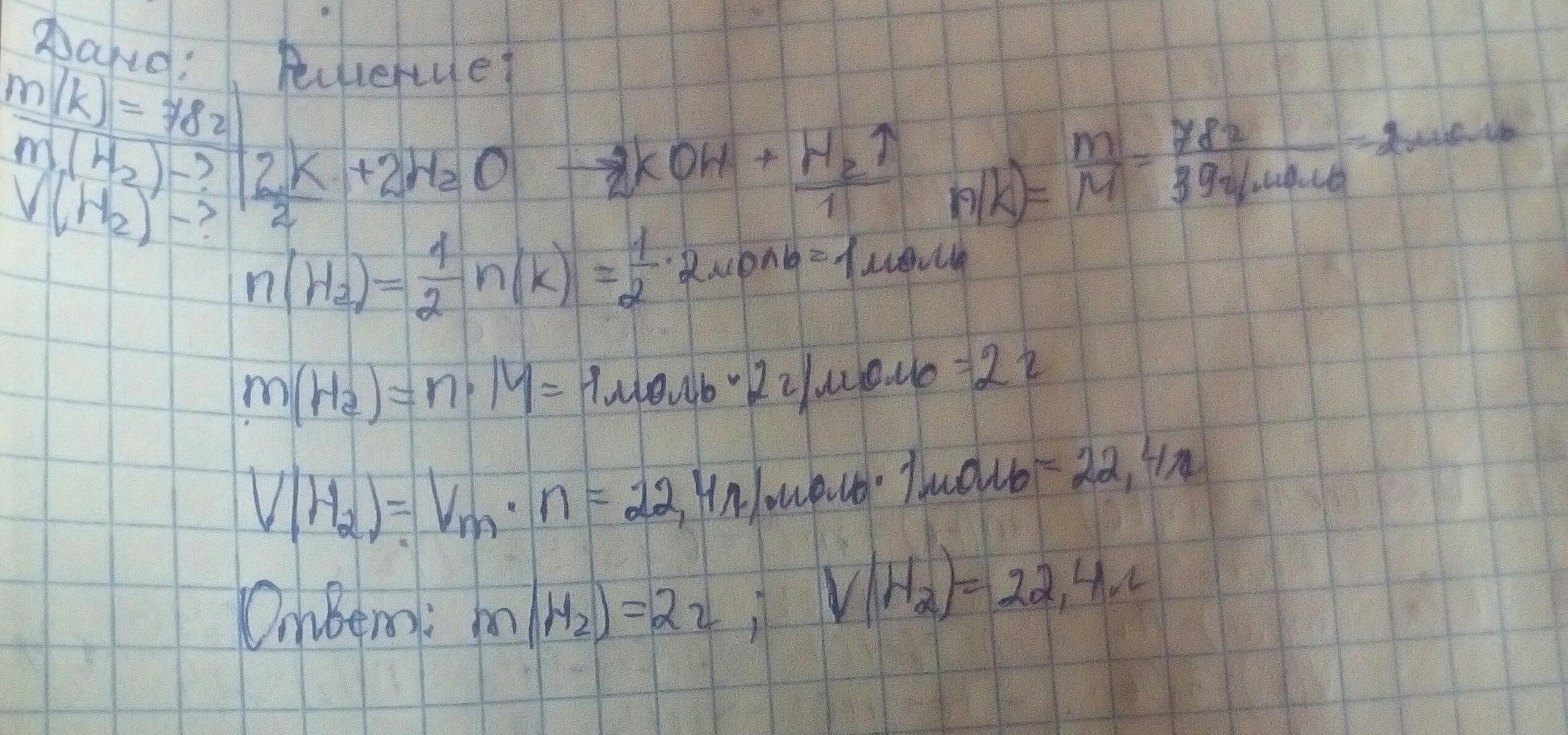 Пожалуйста решите: Вычислите массу и объём водорода (H2), выделившегося при взаимодействии 78 г калия с водой.