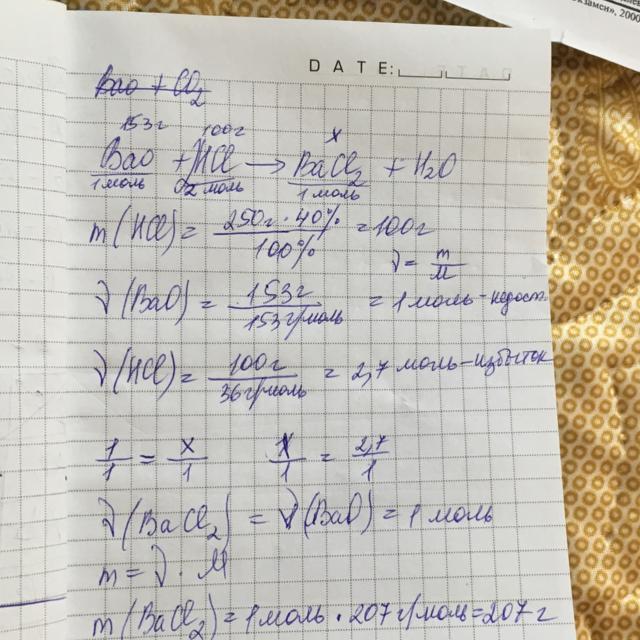 вычислите массу соли полученной при взаимодействии 153 г оксида бария с 250 г 40 % раствора соляной кислоты