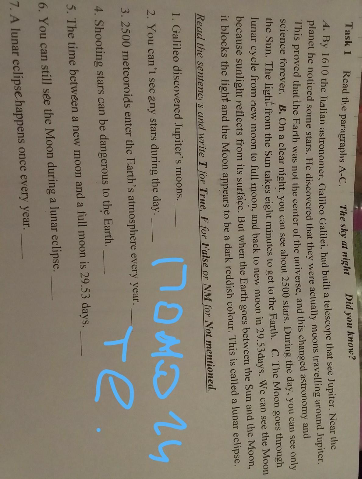 4. К 1610 году итальянский астроном. Галилео Галилей построил телескоп, который видит Юпитер. Возле планеты он заметил несколько звезд. Он обнаружил, что это на самом деле спутники, путешествующие вокруг Юпитера. Это доказывало, что Земля не была центром вселенной, и это навсегда изменило астрономию и науку. B. В ясную ночь вы можете увидеть около 2500 звезд. Днем видно только Солнце. Свет от солнца нужно восемь минут, чтобы добраться до Земли. C. Луна проходит лунный цикл от новолуния до полнолуния и обратно в новолуние через 29.53 дня. Мы видим Луну потому, что солнечный свет отражается от ее поверхности. Но когда Земля проходит между Солнцем и Луной, она блокирует свет, и Луна кажется темного красноватого цвета. Это называется лунным затмением.