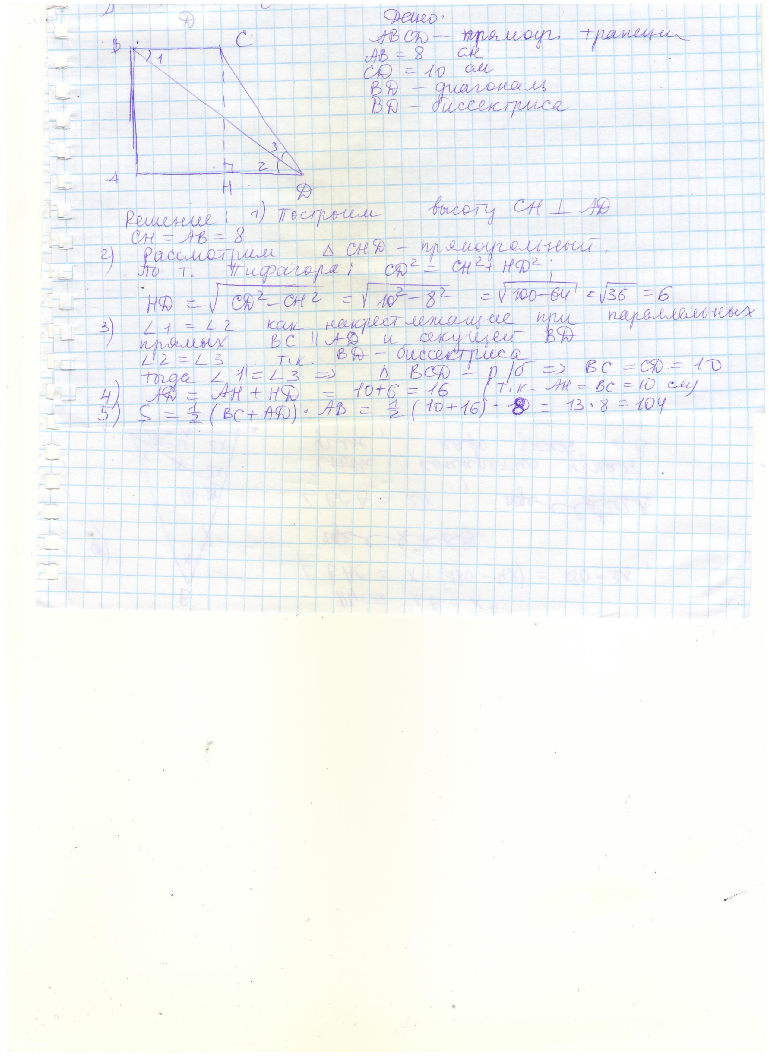 В прямоугольной трапеции диагональ является биссектрисой острого угла. Найдите площадь трапеции, если боковые стороны равны 8 см и 10 см. Пожалуйста срочно, если можно, то с рисунком. Даю много баллов. 2