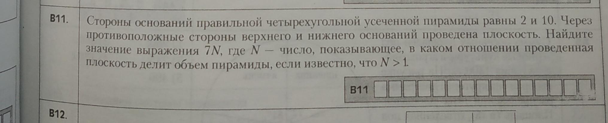 Пусть a и b - стороны оснований, а h - высота исходной усечённой пирамиды. Разделим тело на три составляющих: по краям две четырёхугольные пирамиды с основаниями в виде прямоугольника со сторонами a и (a−b)/2 и высотой h, а в центре - половина призмы с основанием в виде прямоугольника со сторонами a и b и с высотой h. Объём всего тела равен сумме объёмов его частей: