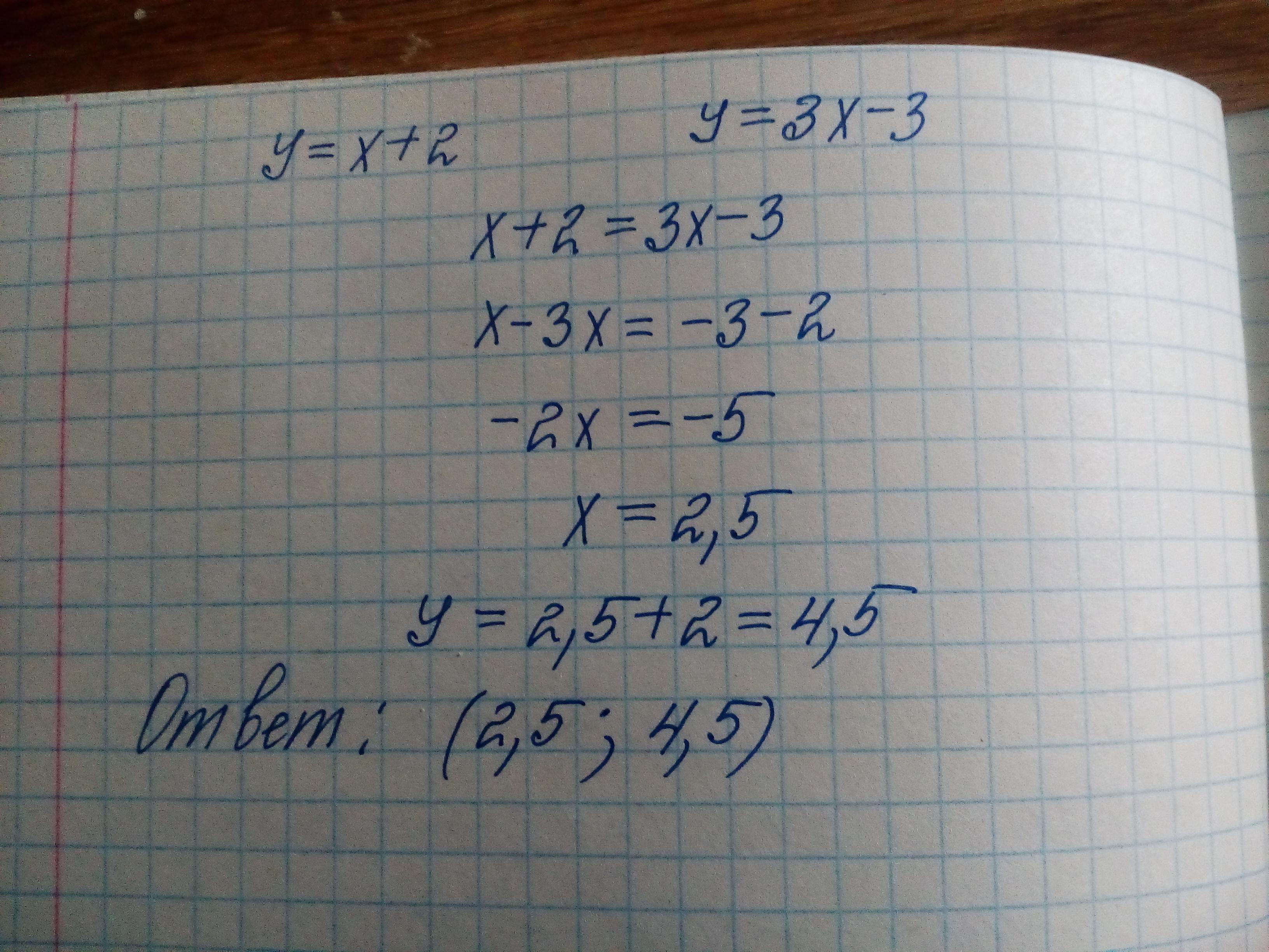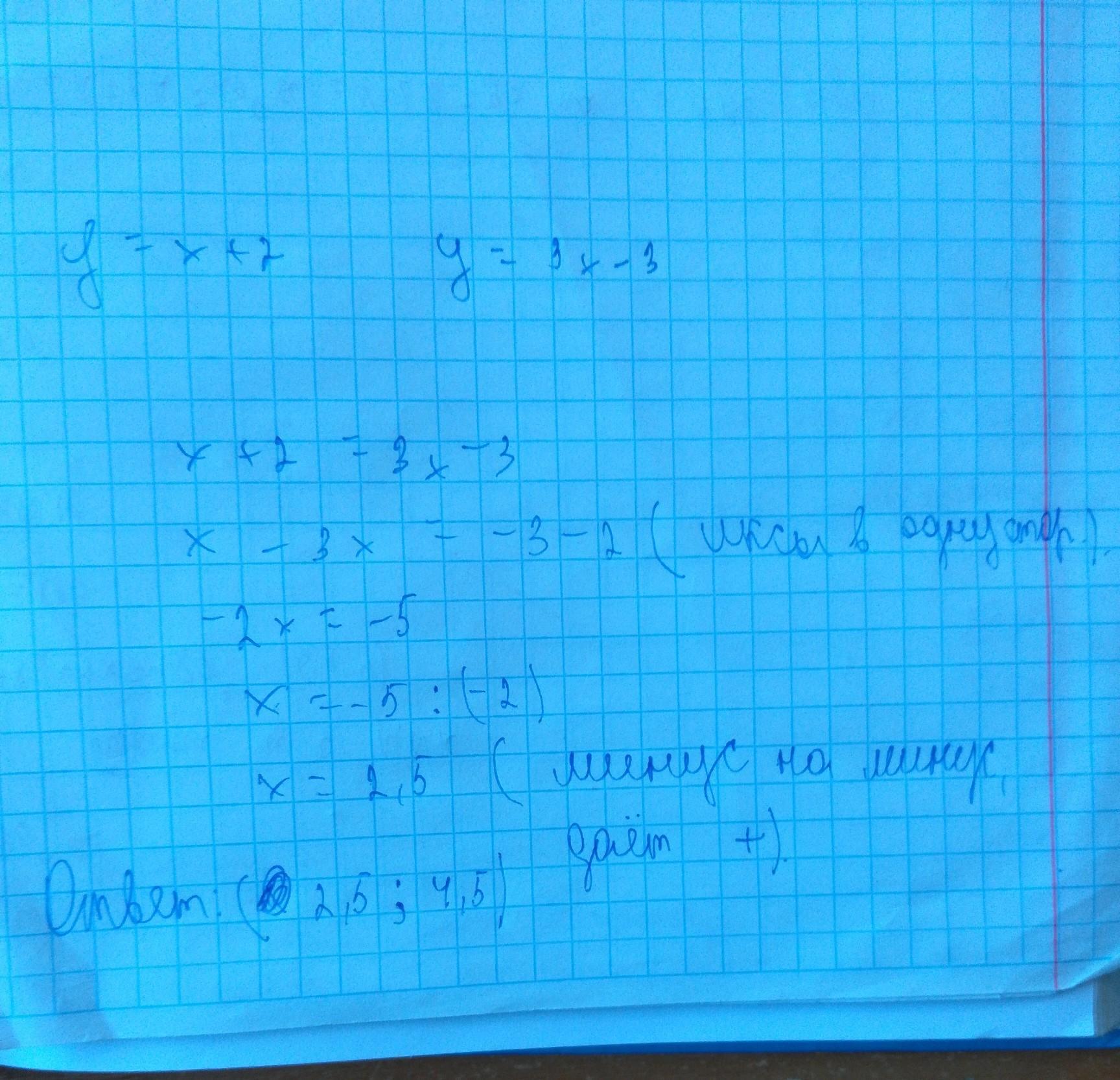 Найди, не выполняя построения, координаты точки пересечения графиков линейных функций: y=x+2 и y=3x−3 .