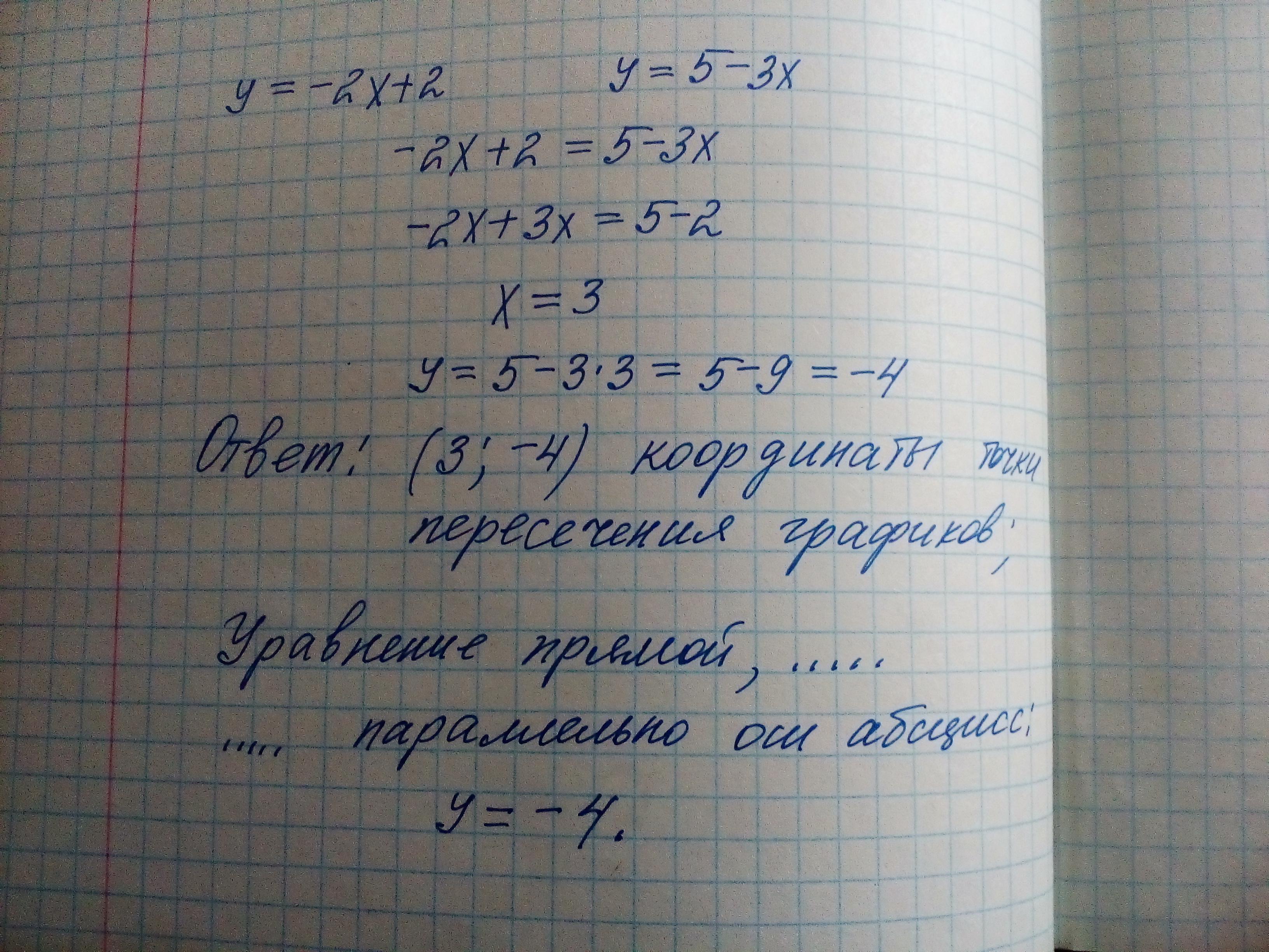 Составь уравнение прямой, проходящей через точку пересечения графиков линейных функций y=−2x+2 и y=5−3x параллельно оси абсцисс.