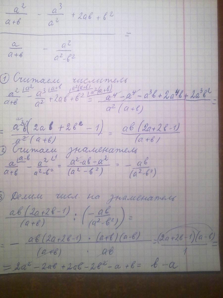 Решите уравнения: 1) (a2/a+b вычесть от этой дроби a3/a2+2ab+b2) / (a/a+b вычесть от этой дроби a2/a2-b2;