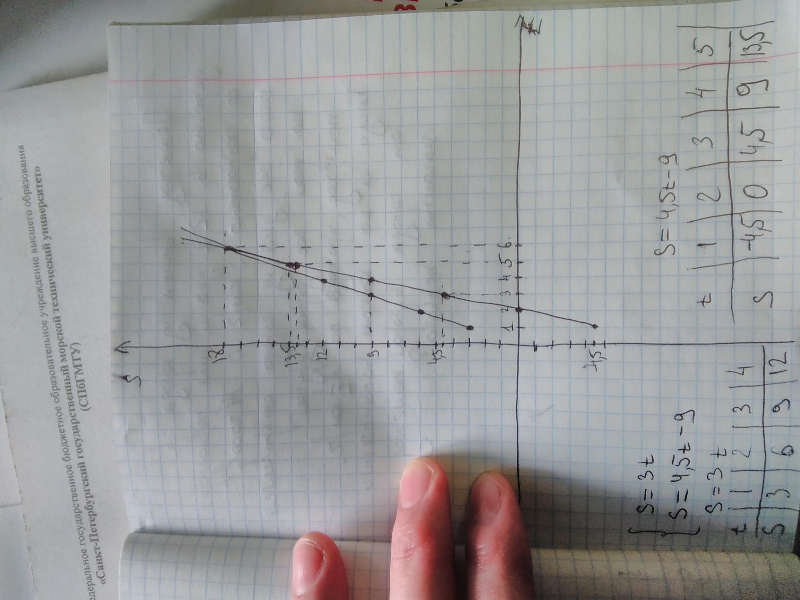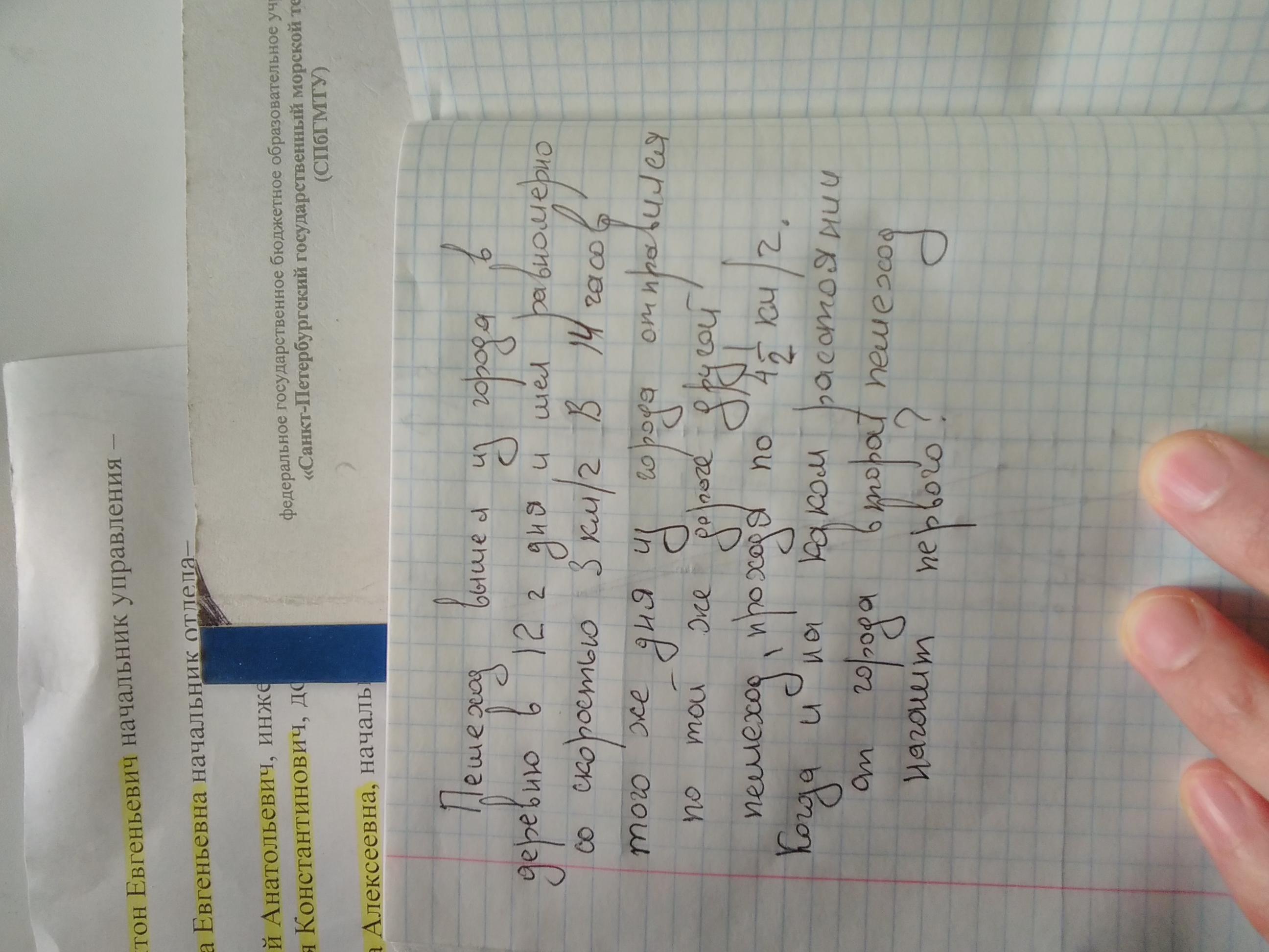 1 пешеход вышел в 12 и к 14 часам прошёл 6 км ( 2 * 3) дальше по формуле S/(v1 - v2) = 6/ (4,5 - 3) = 4