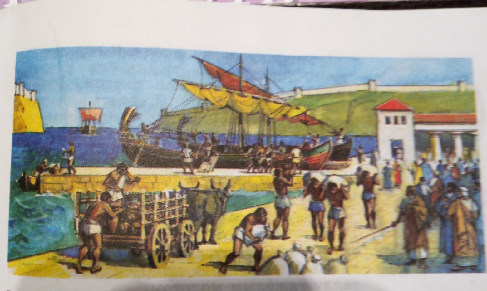 Перед нами изображена древняя картина. На ней мы видим как люди собирают товар и скоро поедут торговаться с разными людьми... Лежит много межков которые разгружают мужчины. Похоже это рабы, потому что видно людей с плетнями. Некоторые корабли уже отправились на торг. Их паруса раскрашены в яркие цвета-красный и жёлтый. На быков грузят телеги с товаром. На этой картине много людей и поднялась большая суматоха