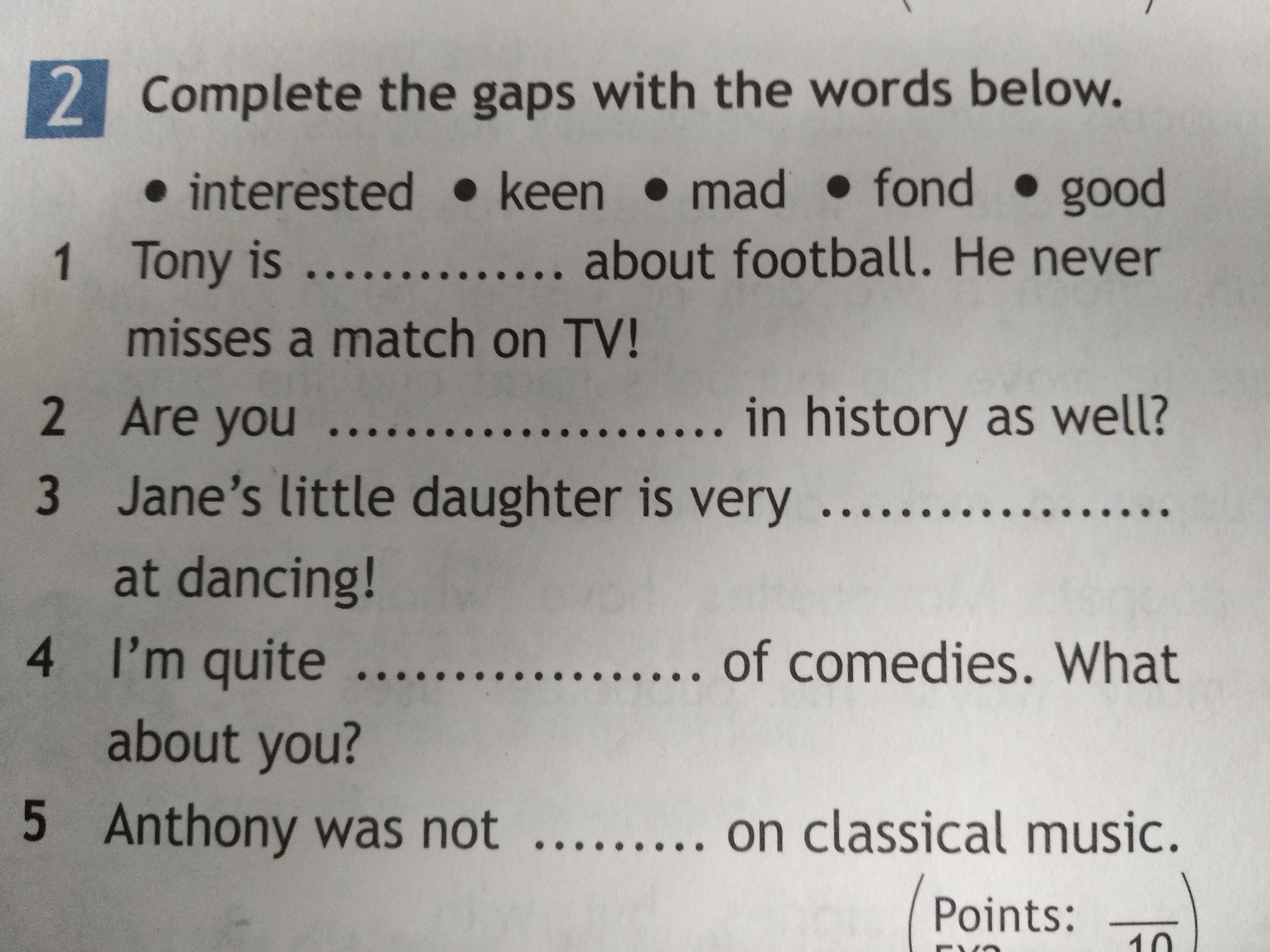 1 mad, 2 interested, 3 good, 4 fond, 5 keen