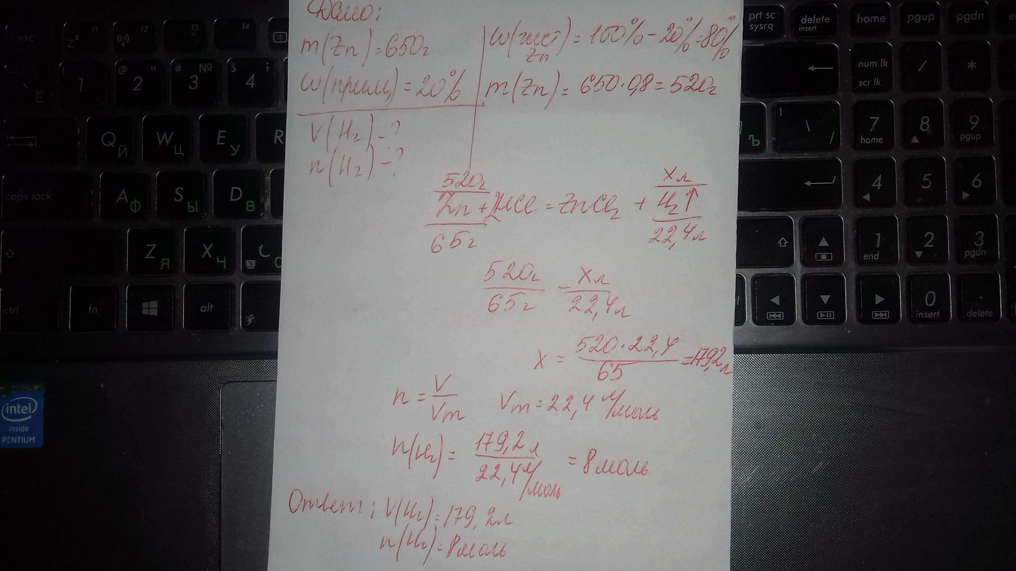 Какой объём водорода (н. у.) образуется при взаимодействии 650 мг. цинка, содержащего 20% примесей, с избытком соляной кислоты? Каково количество водорода?