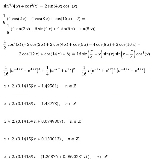 1/16 (e^(-4 i x)-e^(4 i x))^4+1/4 (e^(-i x)+e^(i x))^2 = 1/16 i (e^(-i x)+e^(i x))^4 (e^(-4 i x)-e^(4 i x))