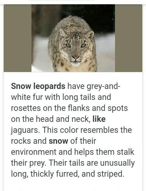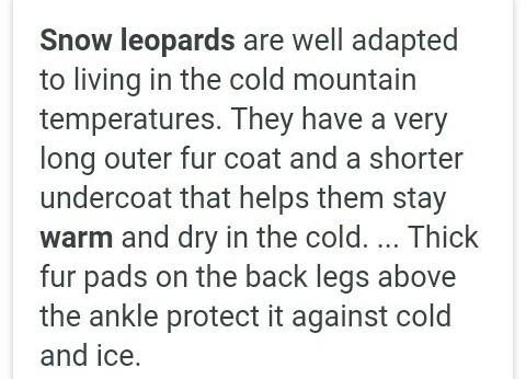 5)They are insulated by thick hair, and their wide, fur-covered feet act as natural snowshoes. Snow leopards have powerful legs and are tremendous leapers, able to jump as far as 50 feet.
