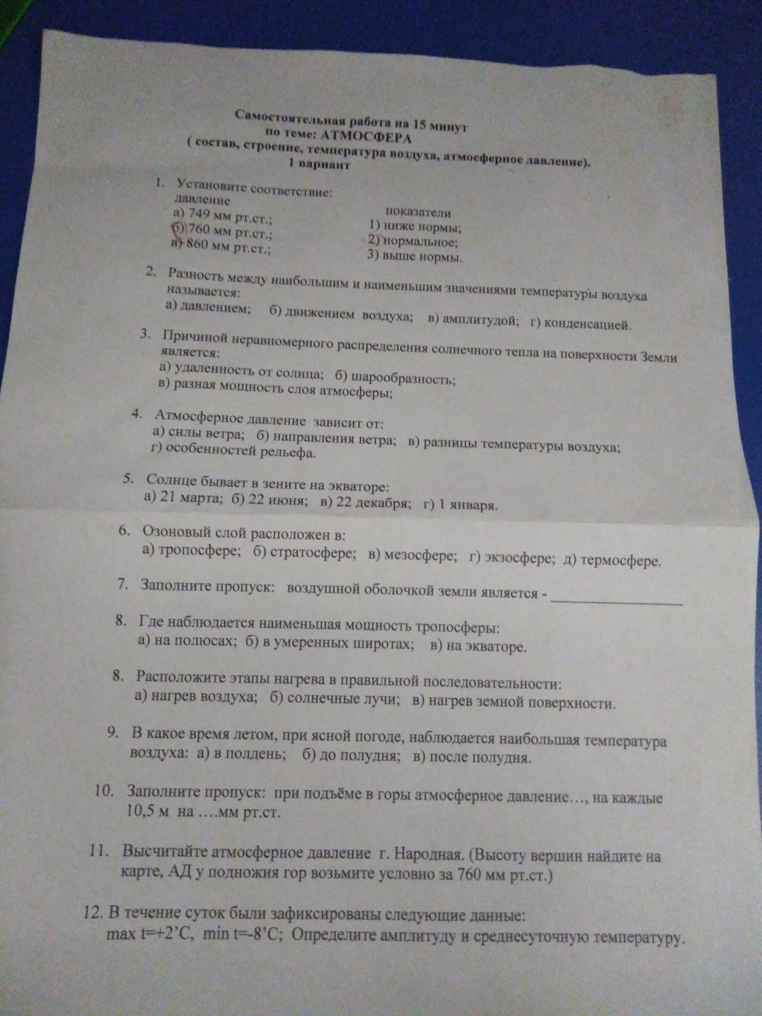 География 6 класс самостоятельная работа за 15 минут по теме: Атмосфера (состав, строение, температура воздуха, атмосферное давление)