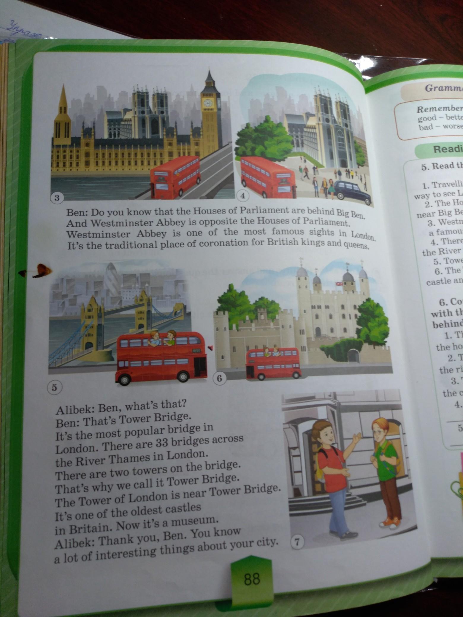 Алибек: Бен, что это? Бен: Это Тауэрский мост. Это самый популярный мост в Лондоне. В Лондоне через реку Темзу проходит 33 моста. На мосту две башни. Вот почему мы называем это Тауэрский мост. Лондонский Тауэр находится возле Тауэрского моста. Это один из старейших замков