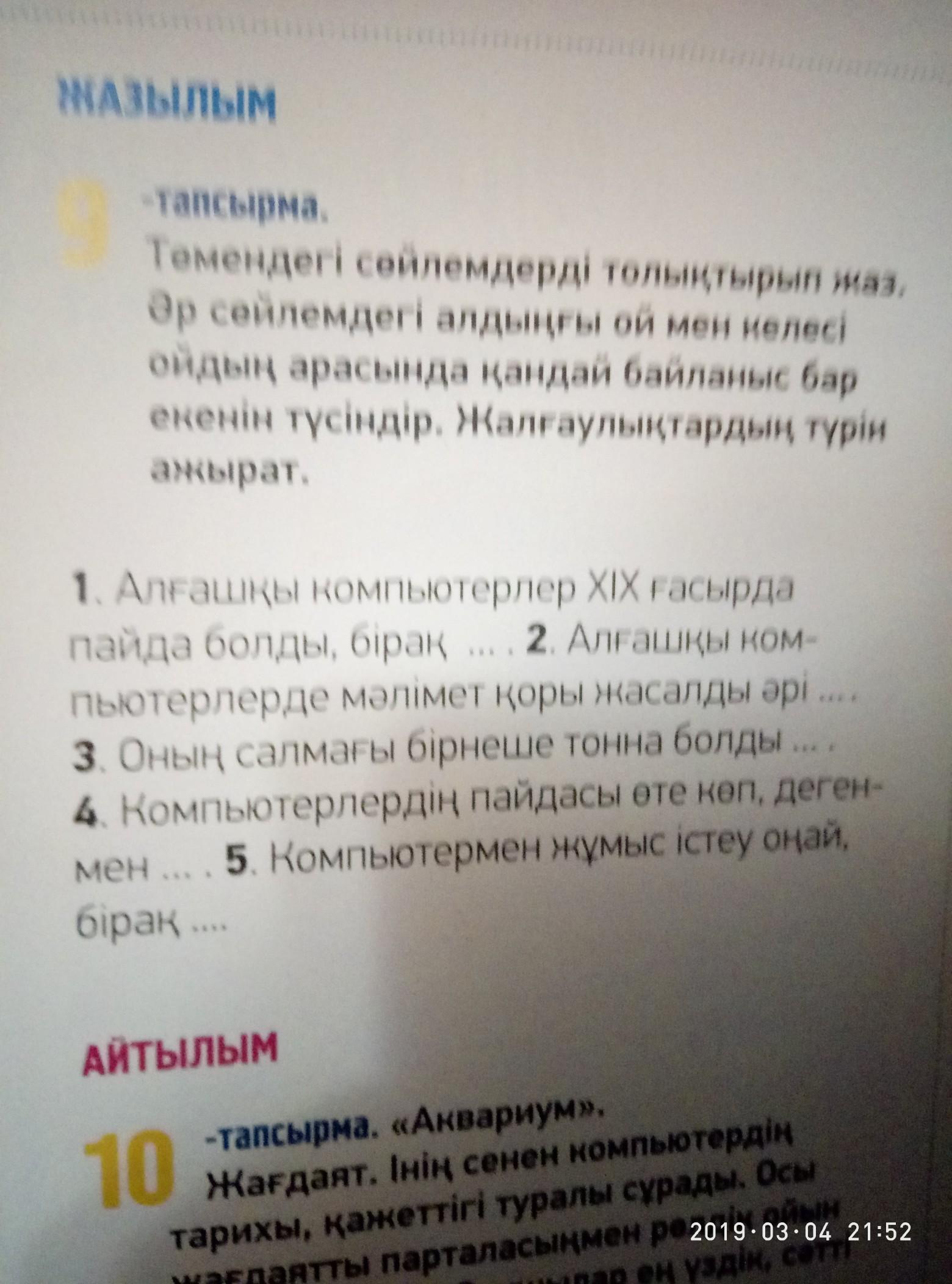 төмендегі сөйлемдері толықтырып жаз. әр сөйлемдегі алдынғы ой мен келесі ойдың арасында қандай байланыс бар екенін түсіндір жалғаулықтары түрін ажырат