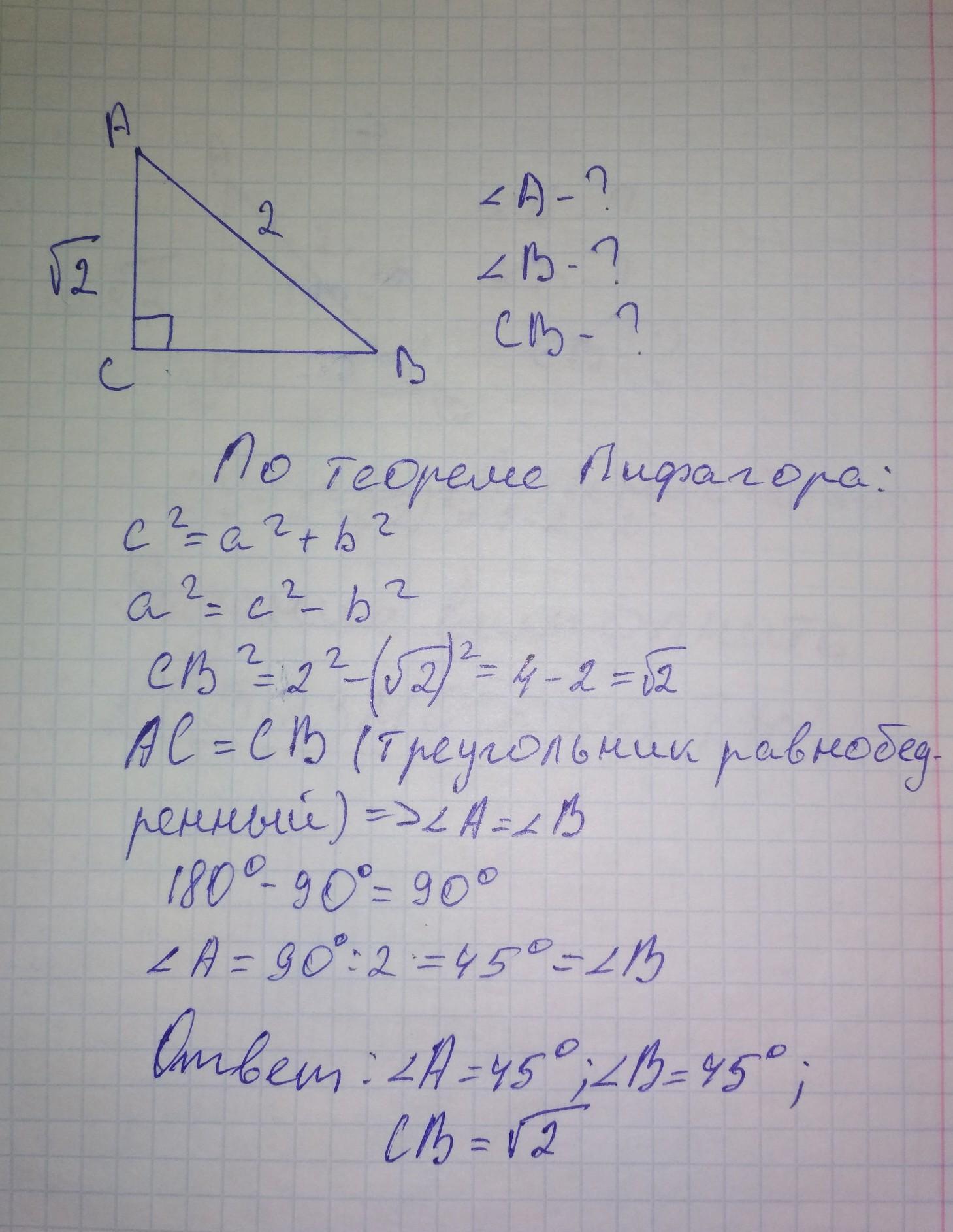 В прямоугольном треугольнике гипотенуза равна 2 см один из катетов равен корень из 2 найдите катет и острые углы