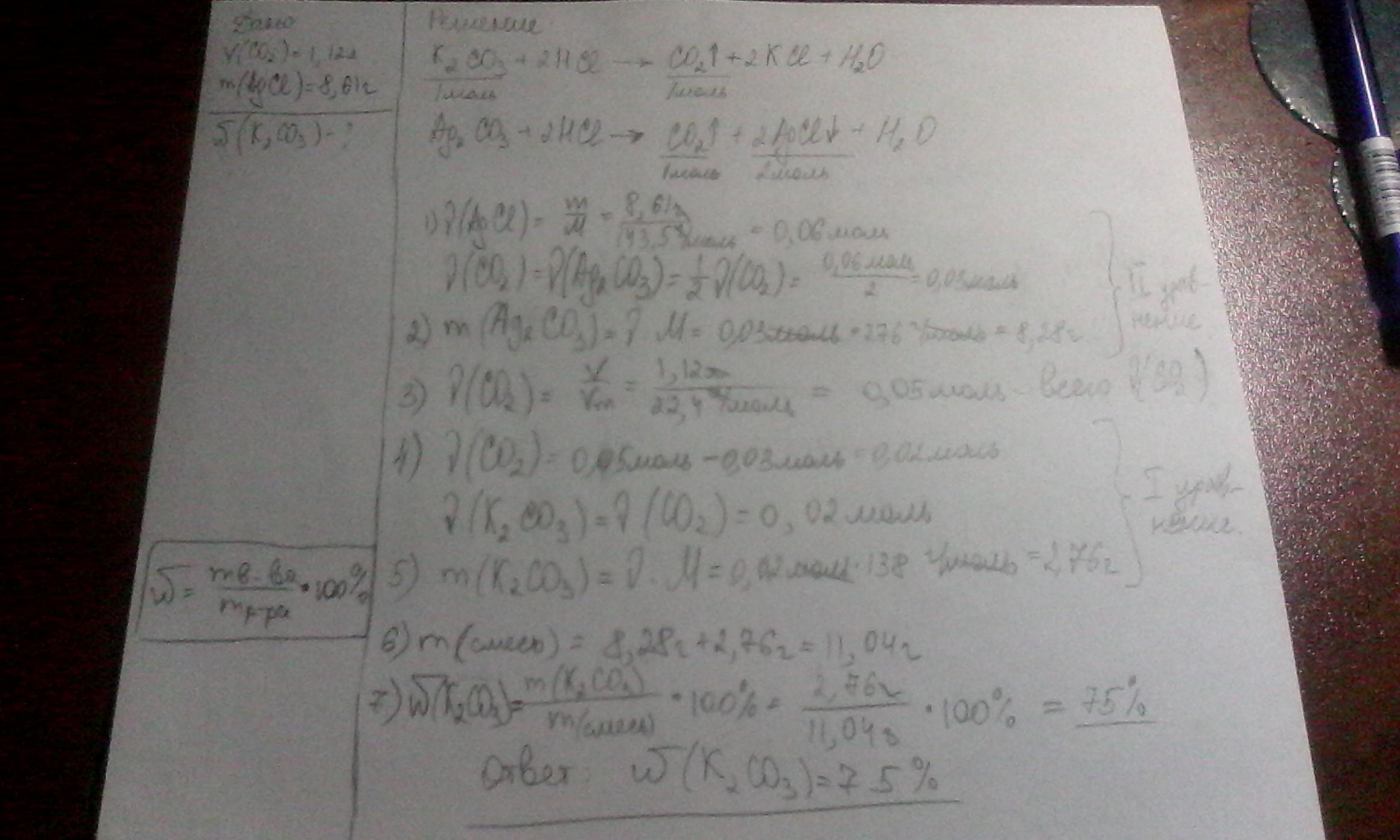 Смесь карбоната калия и карбоната серебра обработали избытком раствора соляной кислоты. При этом выделилось 1,12 л (при н. у.) газа и образовалось 8,61 г осадка. Определите массовую долю (в %) карбоната калия в исходной смеси солей. В ответе запишите уравнения реакций, которые указаны в условии задачи, и приведите все необходимые вычисления.