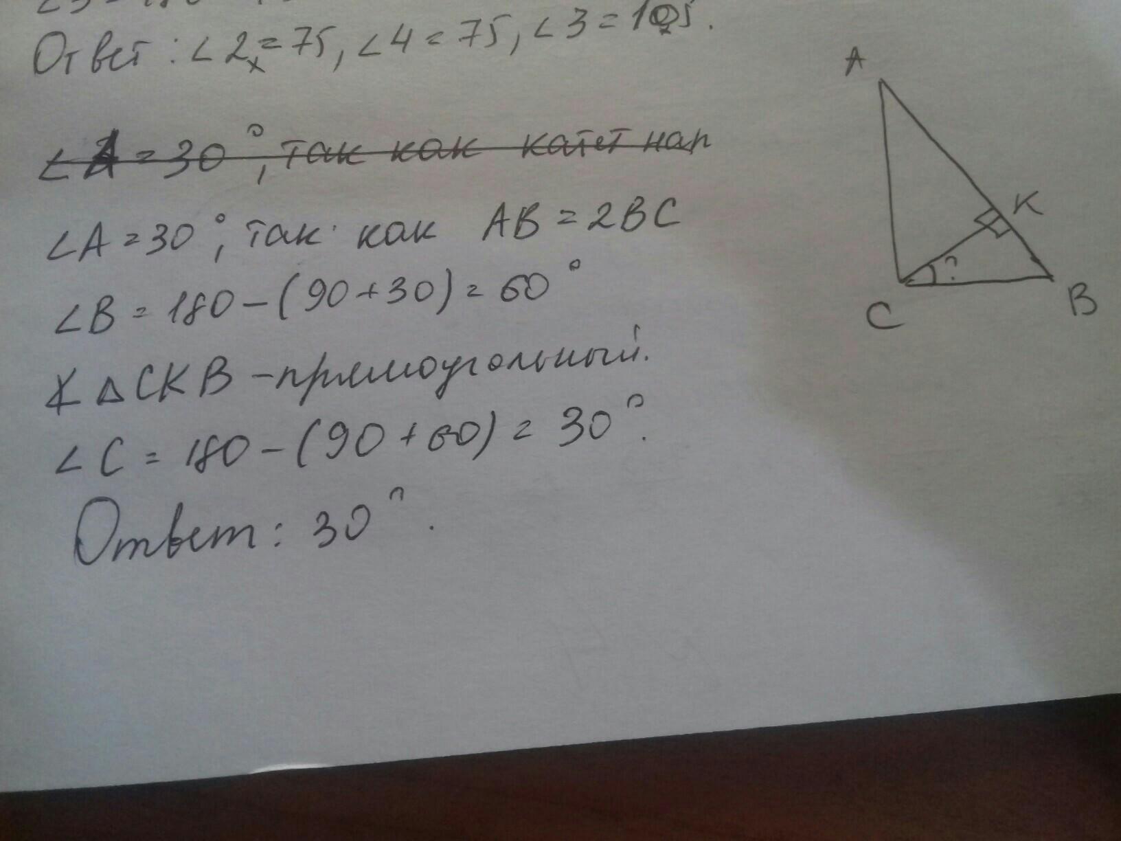 В прямоугольном треугольнике АBC (уг.C=90град) провели высоту CK . Найдите угол BCK, если АB=14см,BC=7 см