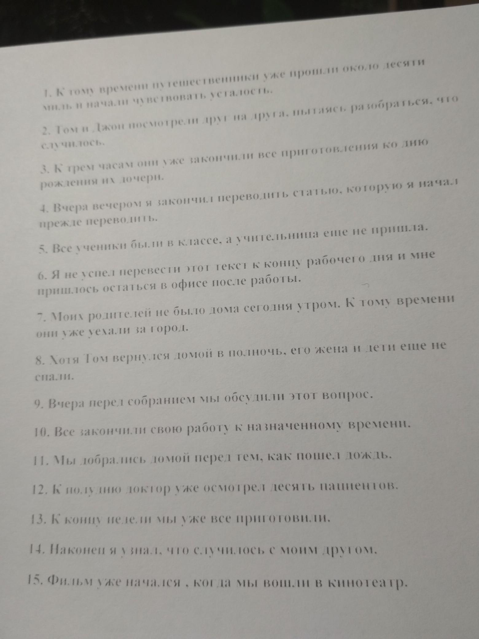 6) I did not have time to translate this text by the end of the working day and I had to stay in the office after work.