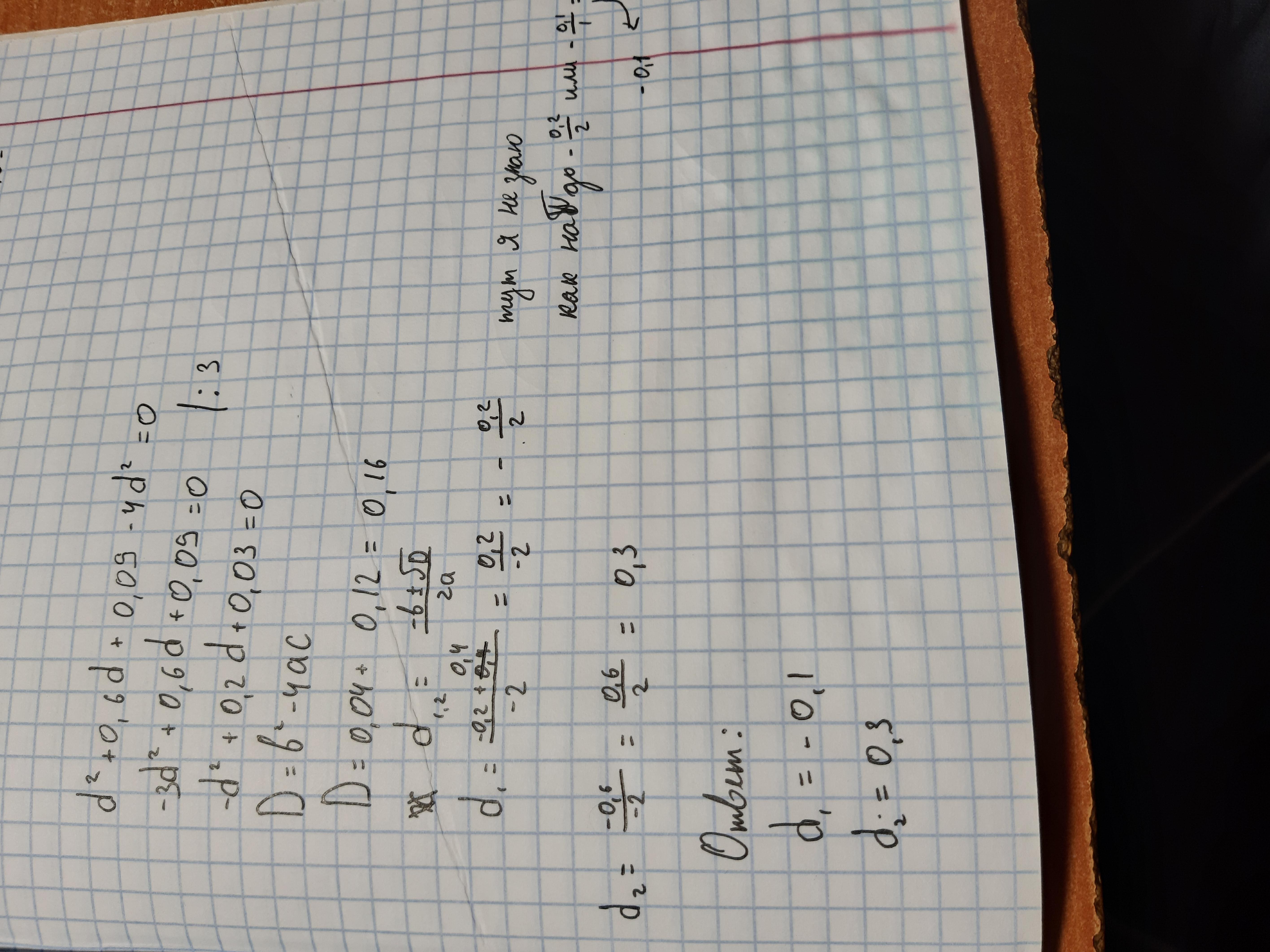 Реши уравнение d^2+0,6d+0,09−4d^2=0
