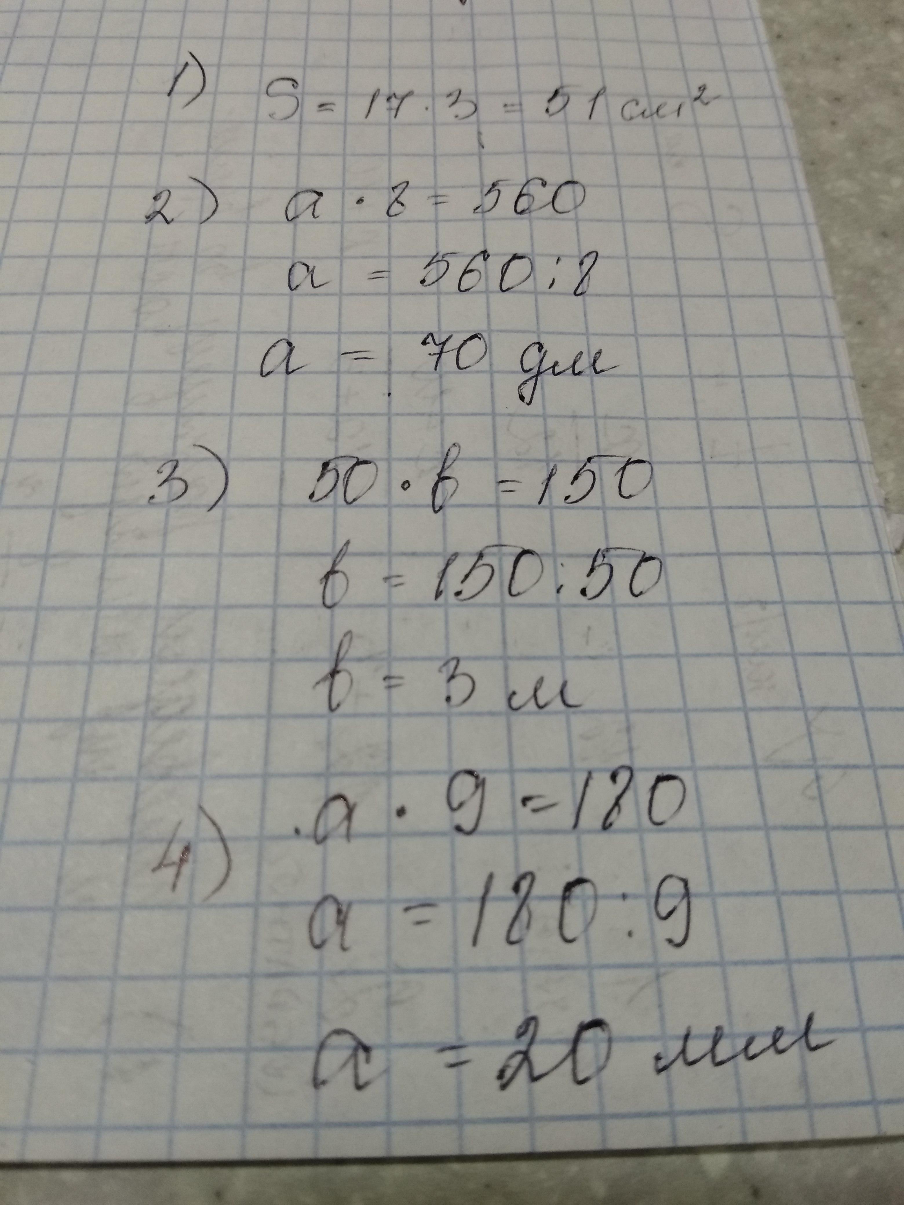 3) существует только прямоугольник одна сторона которого равна 50 м, а площадь равна 150 квадратных м, найдите его вторую сторону