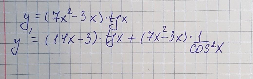 формула (u*v)`=u`*v+u*v`, y`=(14x-3)*tgx+(7x^2-3x)*1/cos^2x