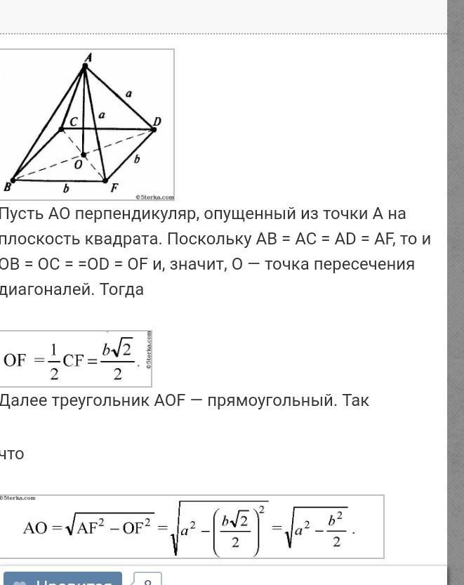 Расстояние от точки А до вершины квадрата равны a. Найдите расстояние от точки А до плоскости квадрата, если сторона квадрата равна b.