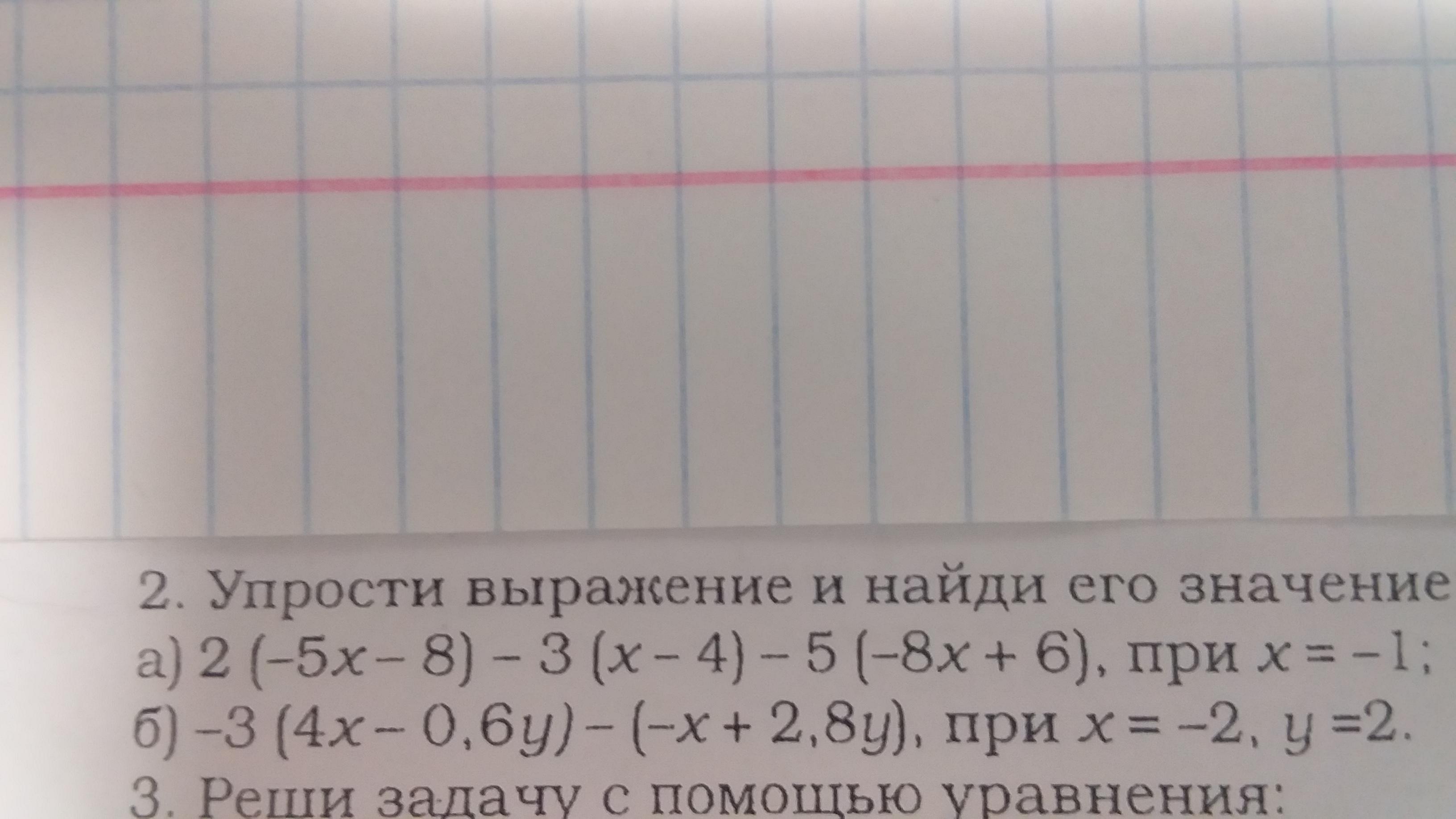 2)-3(4х-0.6у)-(-х+2.8у)= -3(4×-2-0.6×2)-(2+2.8.×2)= 24-1.2-2-5.6=15.2
