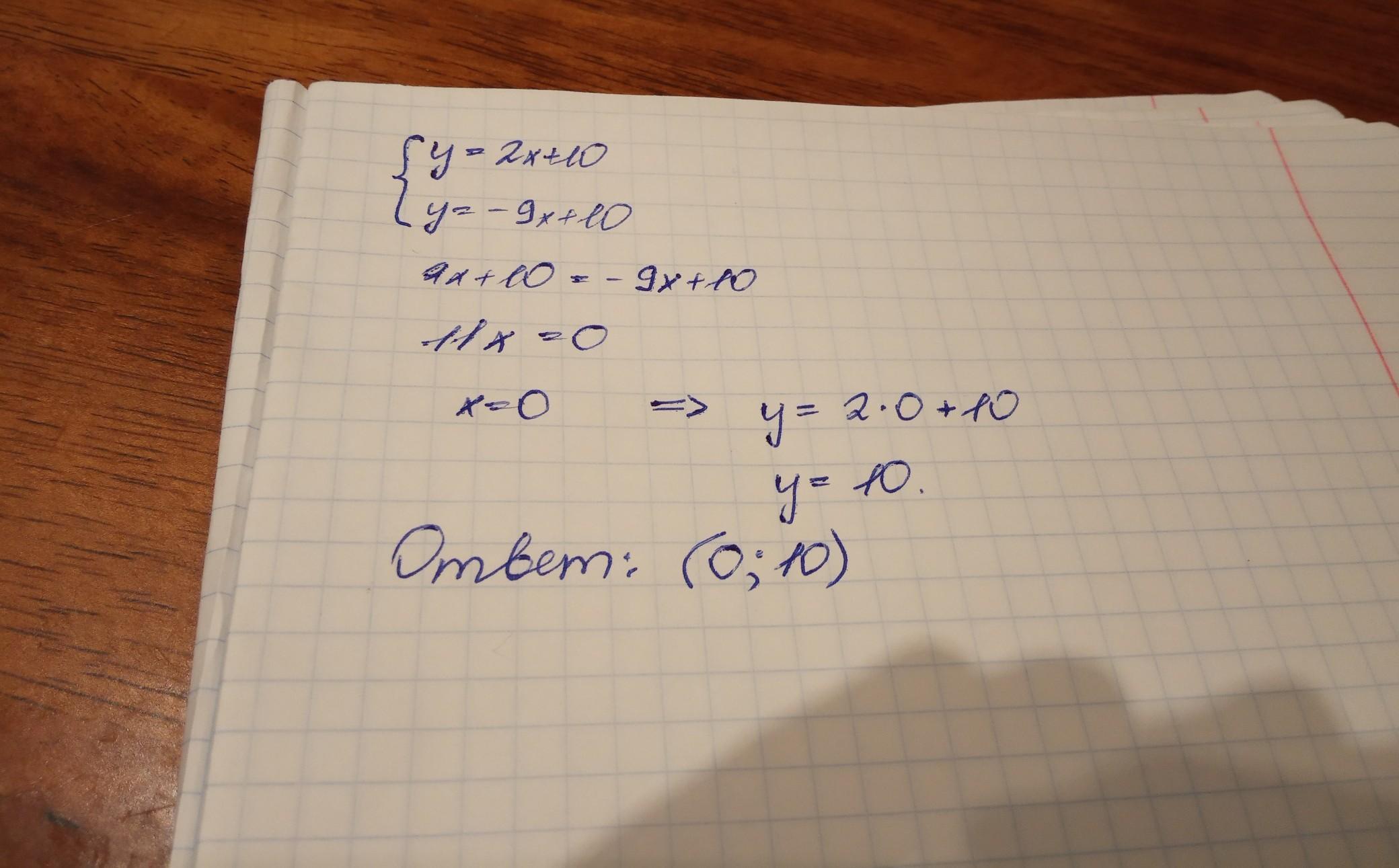 Определи точку пересечения прямых y=2x+10 и y=-9x+10, не выполняя построения графиков.