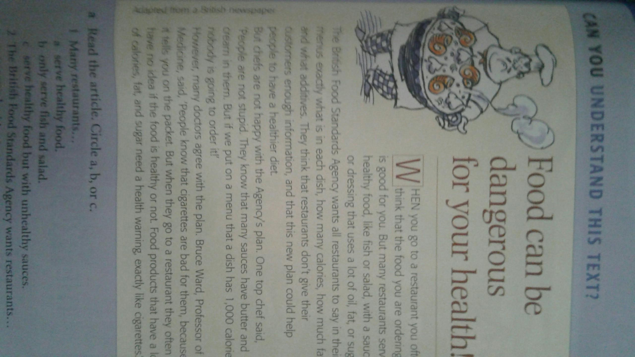 Когда ты идешь в ресторан, ты думаешь, что еда, которую ты приготовил, хороша для тебя. Но во многих ресторанах здоровая пища, такая как рыба или салат, с соусом или заправкой, которая использует много масла, жира или стандартов, хочет, чтобы все рестораны сказали, какие добавки. Они думают, что рестораны не дают их, и что этот новый план может помочь поварам, которые не довольны планом Агентства. Один шеф-повар сказал: «Опле не глупы». Они знают, что у многих соусов есть масло и n их. Но если мы включим в меню то, что блюдо имеет 1000 калорий, никто не собирается его заказывать. Однако многие врачи согласны с планом. Брюс Уорд, профессор медицины, сказал: «Люди знают, что сигареты вредны для них, потому что они говорят вам на пачке. Но когда они идут в ресторан, они часто понятия не имеют, здоровая еда или нет. Пищевые продукты, содержащие сахар и сахар, нуждаются в предупреждении о вреде для здоровья.