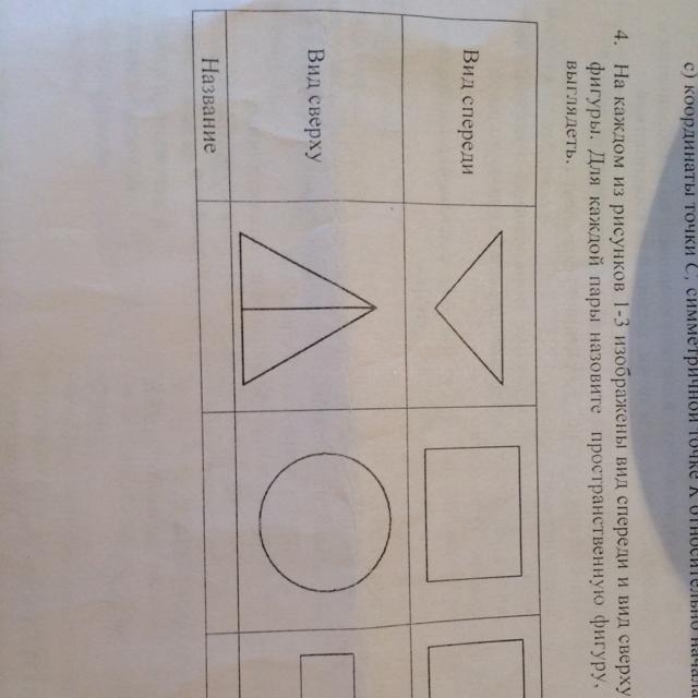 На каждом из рисунков 1– 3 изображены вид спереди и вид сверху пространственной фигуры .Для каждой пары назовите пространственную фигуру ,которая может так выглядеть ?пожалуйста помогите сор!!!!!
