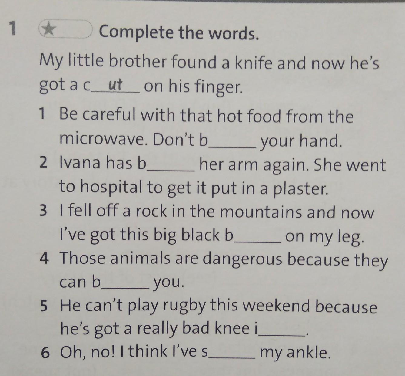1 burn 2 broken 3 bruise 4 bite 5 injury 6 sprained